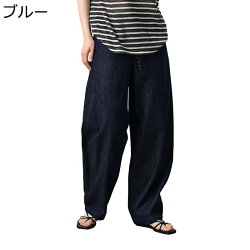 ロングパンツ レディース ワイドパンツ 綿麻 涼し気 デニム サルエルパンツ 無地 ハイウェス...