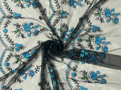 スイス製チュールレース【A7-11】 レーヨン100% 黒のレーヨンチュールにブルーとグリーン...