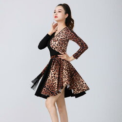 ラテン ドレス 社交ダンス レディース 長袖 レオパード Aライン 膝上丈 エレガント 練習着 ス...