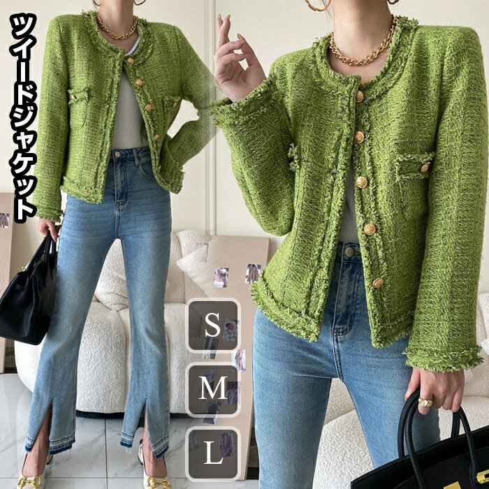 ツイードジャケット レディース 春 ジャケット アウター ショート 羽織り ノーカラージャケッ...