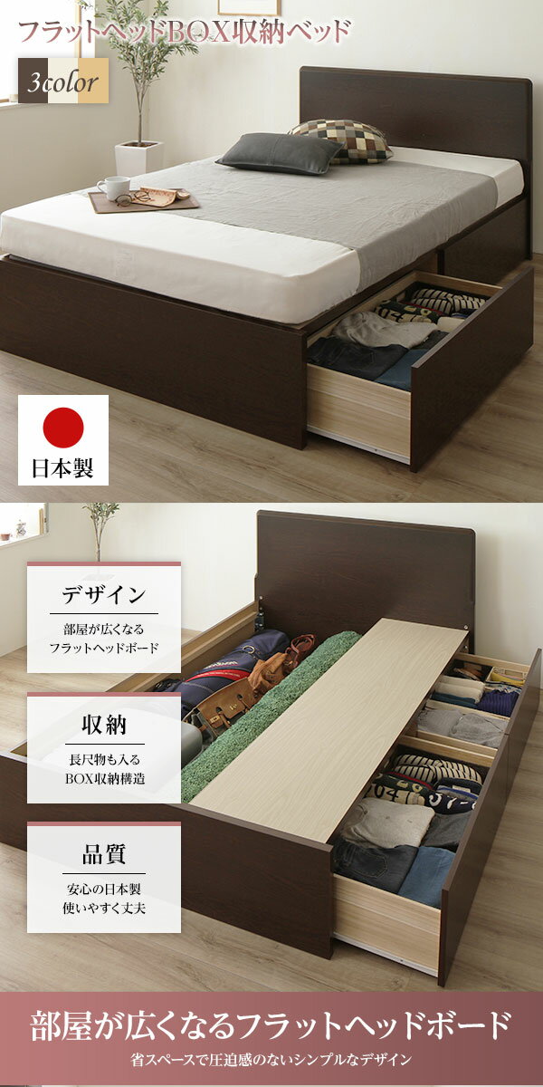 ■サイズ・色違い・関連商品 セミシングル(全3色) フレームのみ 国産ポケットコイルマットレス付き シングル(全3色) フレームのみ 国産ポケットコイルマットレス付き セミダブル(全3色) フレームのみ 国産ポケットコイルマットレス付き セミシングル(全3色)<組立設置付き> フレームのみ 国産ポケットコイルマットレス付き シングル(全3色)<組立設置付き> フレームのみ 国産ポケットコイルマットレス付き セミダブル(全3色)<組立設置付き> フレームのみ 国産ポケットコイルマットレス付き ■商品内容本商品は「組立設置サービス利用しない」お客様組立の配送でございます。【配送希望日時指定について】 ・この商品は、配送希望日のご指定が可能です。時間帯のご指定はお受けできかねます。 ・注文時、最終確認画面にて配送希望日をご指定ください。 ・商品の入荷状況、配送地域、配送業者の状況等によって、 配送日時のご希望に沿えない可能性がございます。 ・ご注文が土日祝日の前日の場合、最短での配送希望日を承ることが できない可能性がございます。 ・最短での配送をご希望の場合は、指定なしでご注文ください。【ご注意事項】 ・商品注文後のキャンセルや返品は承りかねます。 ・本商品は離島への配送ができません。 ・一部地域への配送時には追加送料がかかる場合がございます。 ・大型商品は出荷から到着までに 2 - 5 日程度かかる場合がございます。 ・配送員が商品の開梱・組立・ 設置作業を行います。商品説明【デザイン】部屋が広くなるフラットヘッドボード ・省スペースで圧迫感のないシンプルなデザイン スペースにゆとりが生まれます ・空間が広がる理由は「約3cm」 一般的なベッドよりも20cm近くコンパクトに、 さらに収納力も抜群だからチェストも不要に。 【収納】長尺物も入るBOX収納構造 ・大容量のBOX収納構造 頑丈で、ホコリの侵入も防ぎ、長物も収納できる ・BOX構造とは 引き出し部の上下左右が囲われた箱のような構造なので、 丈夫でホコリの侵入を防ぎます。 ・画期的な収納構造 一般的なベッドは荷重を支えるサイドフレームが必要ですが、 BOX構造は不要、その部分を収納スペースとして有効活用できます。 さらに、引き出しのない空間は長物などを収納できる大容量スペースになります。 ・収納部は組み立て済み 引き出し収納部はすべて組み立て済でお届け。組み立て簡単です。 【品質】安心の日本製 使いやすく丈夫 ・ながく使える日本製品質 家具作りのプロによって設計された安心の数々 ・細部までこだわった、使いやすさの追求 -引出しはスライドレールを採用。たくさん収納しても開閉スムーズ -長物収納部分の床板は取っ手付き。大きな床板も楽々開けられます。 -引き出しの底板にも化粧板を使用。木クズが出にくく見た目にも美しい。 -引き出しの底には補強入り。収納物をしっかり支え底が抜けません。 ・ぴったり並べて使える 2台並べても隙間ができないので、1台の大きなベッドとしてご利用も。 ・耐荷重180kgの頑丈設計 お布団でも安心してご利用いただけます。 ・職人と機械がつくりあげる「日本品質」 創業50年、関東の老舗国産家具メーカー。創業以来、収納家具の生産技術を 徹底的に磨き続け完成させたのが職人と機械を組み合わせた 半自動一貫生産ライン。そこで作られる日本の住環境に寄り添うベッドは 設計・製造・組立のサイズまで妥協せず、丁寧に作り上げた「日本品質」 ぜひ、その使いやすさをご実感ください。 ・低ホルムアルデヒドF☆☆☆☆ ホルムアルデヒドはシックハウス症候群になる原因の一つで家具や 芯材や塗装にも含まれています。ご家族皆様が安心して ご利用いただける本商品は低ホルムアルデヒドF☆☆☆☆を使用しております。【国産ポケットコイルマットレスもご用意】 ・体型や姿勢の凹凸に合わせてフィット コイルが1つずつ不織布の袋に包まれ独立しており、 荷重のかかる部分だけ沈み込みます。 身体のラインにそって支えるため体圧分散にすぐれています。【組立設置サービス】 ・組立が不安な方は本サービスをご利用ください。 配送スタッフ2名が搬入、開梱、組立、設置、梱包材廃棄を行います。■商品スペック■ベッドフレーム本体【サイズ】 セミシングル:(約)幅83×長さ199.5×高さ80cm シングル :(約)幅98×長さ199.5×高さ80cm セミダブル :(約)幅120×長さ199.5×高さ80cm 床面までの高さ:(約)30cm【収納部有効内寸】 引き出し :(約)幅87×奥行38×深さ15cm 長物収納 セミシングル:(約)幅29×奥行193×深さ23cm シングル :(約)幅44×奥行193×深さ23cm セミダブル :(約)幅66×奥行193×深さ23cm【材質】 プリント紙化粧繊維板、引き出し:桐集成材【カラー】 ダークブラウン、アイボリー、ナチュラル【生産国】 日本【梱包サイズ】個口数:4 セミシングル:(約)7×86×83cm・6×86×33cm・98×36×10cm・33×196×56cm シングル :(約)7×101×83cm・6×101×33cm・98×51×10cm・33×196×56cm セミダブル :(約)7×123×83cm・6×123×33cm・98×73×10cm・33×196×56cm■国産ポケット