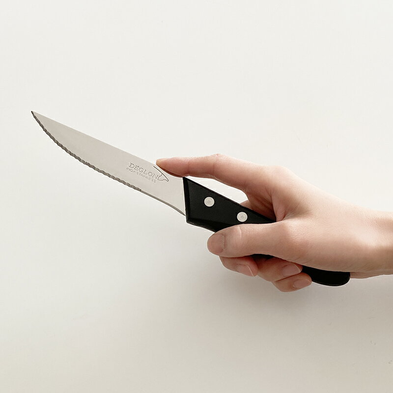 サイズ・全長24cm 刃渡り13cm 柄の太さ1.5cm(一番太い部分) ・重さ66g素材・柄 / ABS樹脂 ・刃 / ステンレススチールご使用にあたり食洗機のご使用はお控えください。配送方法・こちらの商品はゆうパケットでの配送にさせていただいています。他の商品と合わせて発送になった際や、規定のサイズを超えた場合は、ゆうパック配送へ変更させていただきますのでご了承ください。 ・日時指定をご希望の場合はゆうパックでの配送となります。ご希望の際はメッセージにてご記載ください。Deglon [デグロン]フランスの「Thiers ティエ」という町でナイフをはじめ、バリエーションにあふれる調理器具を1921年から4世代に渡り作り続けているファミリーカンパニーのブランド。古くからの技術を活かし変わらない品質を保ち続けています。現在ではフランスの厨房には欠かせない存在になっています。 |アウトドア用にも!おしゃれにもカジュアルにもマッチする軽量なステーキナイフプロも愛用するフランスのキッチングッズブランド・Deglonのステーキ用テーブルナイフです。切先の鋭いステンレス刃に大きめのブランド刻印、二つ目のリベット。割と無骨なシルエットでアウトドアでもよく似合いそうなデザイン。スレやキズもいい味になっていきそうですね。一人用のテーブルウエアはもちろん、大皿で豪快に供される大きい肉料理のお取り分けにも。存在感あるステーキナイフ。見た目とは違い、ステンレス製ですが持ち手は樹脂製なので割と軽め。女性でも使ってて疲れにくいと思います。かわいいイラスト入りの簡単な説明書きも同封しています。(本体のみで専用箱は付いておりません。予めご了承ください。)他にもいろいろ。 関連商品はこちらChien シアン テーブルナイフ 4カラー ...MAX MERCHIOR マックスメルヒオール マ...Deglon デグロン ペティナイフ 刃渡り8c...Deglon デグロン トマトナイフ 刃渡り11...PALLARES パラレス キッチンナイフ ボッ...ヨナス ピーラー I型 ステンレス Jonas ...Todaiトーダイ クレーバートング 24cm ...【3サイズ】E.ドゥイルラン 木製スパチ...Jonas ヨナス カッティングシート 37×29...【単色】Solwang ソルワン ディッシュク...