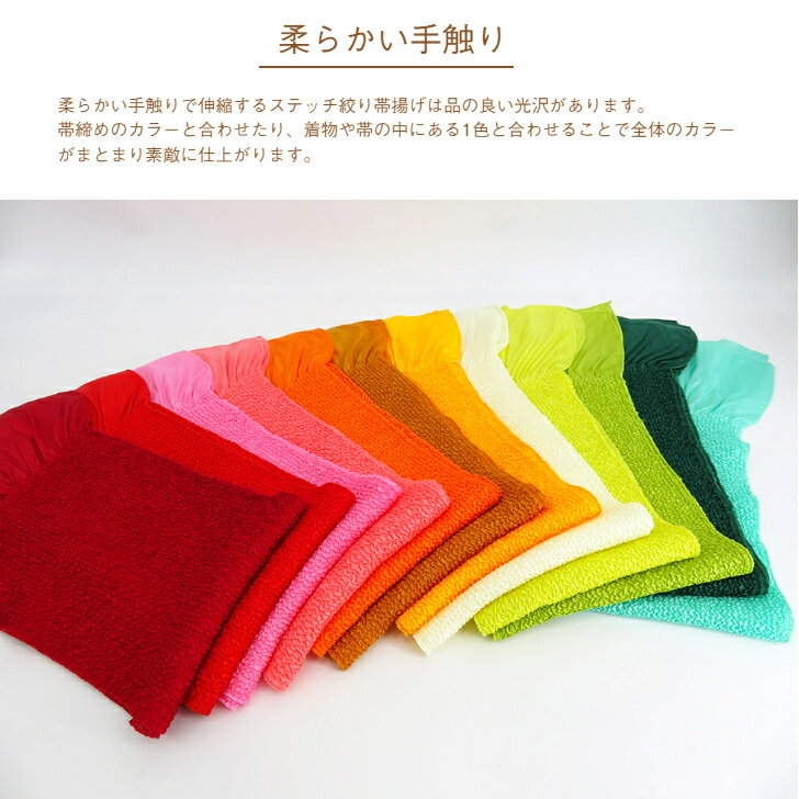 商品情報商品名ステッチ絞り帯揚げサイズ幅 約20cm長さ 約172cm(注意:個体差がございます。予めご了承ください。)品質ポリエステル100%企画 日本製造 中国販売元アンドウ株式会社注意・モニターの発色の具合等によって実際のものと色が異なる場合がございます。予めご了承ください。・加工の性質上、水分や汗により色落ちする場合がございます。・強い力がかかった状態が続くと絞りが伸びることがあります。振袖用絞り帯揚げ 選べる全12色 ポリエステル100% ステッチ絞り帯揚げ おびあげ 振袖 成人式向け 小紋 カジュアル着物 訪問着 柔らかいステッチ絞りの帯揚げ女性の着物姿を華やかにする全12カラー 【ステッチ絞り帯揚げ】成人式の振袖などによく合う、柔らかでしなやかに伸縮するステッチ絞り帯揚げです。丈夫な高級ポリエステル生地です。鮮やかな色合いの帯揚げは豊富なカラーバリエーション。可愛らしいカラー明るく元気なカラー落ち着いたカラー全12色の中からお好みのものをお選びください。帯揚げは着物を着る際に使用するアイテムの一つです。帯揚げを使用することで帯の形を綺麗に見せ、着物全体のコーディネートのアクセントとなります。帯揚げにより着物姿が華やかな印象や引き締まった印象になり、着物コーディネートの大切なポイントです。振袖の場合は思いきり見えるように結び、華やかを演出します。それ以外の着物の場合はあまり見えないように結びます。総絞りの帯揚げは振袖用使われることが多く、ふんわりとしているので、振袖の華やかさをさらに強調するようボリュームを出すことができます。結び方を工夫すればさらに個性的なコーディネートが完成します。振袖にはもちろん、カジュアルな着物や小紋などお好みで合わせてみてください。 10