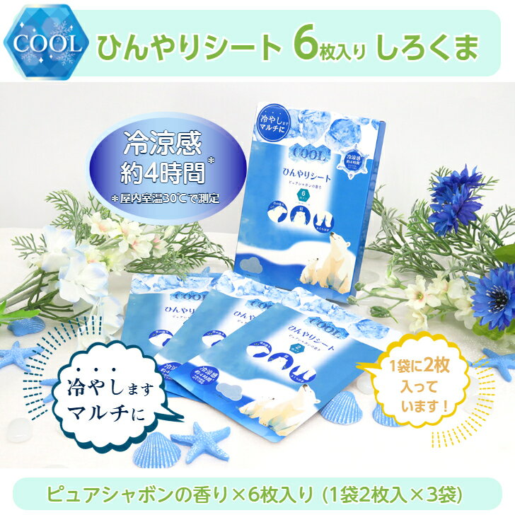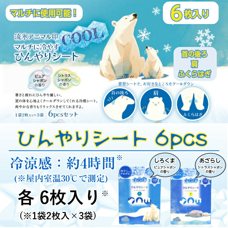 クールシート【ひんやりシート 6P (しろくま/あざらし)】 6枚入り(1袋2枚入り×3袋)《 ピュアシャボンの香り/シトラスシャボンの香り》 首の後ろ 肩 ふくらはぎ 冷涼感 約4時間 使い捨てシート ほんやら堂