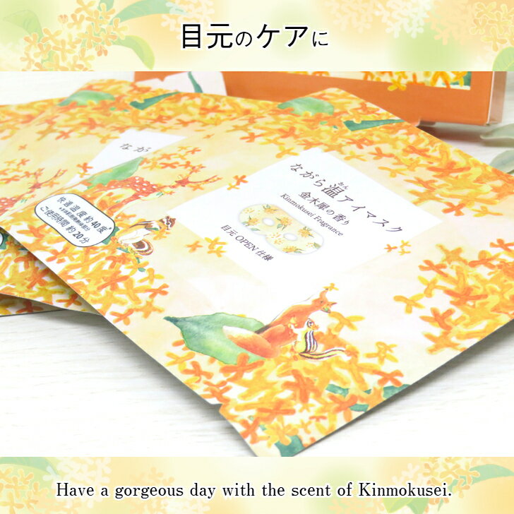 商品情報商品名ながら温アイマス 金木犀 3P〔キンモクセイの香り〕素材表面材/ポリエチレンテレフタレート・ポリエチレン・ポリプロピレン・香料発熱体/鉄粉・水・活性炭・バーミキュライト・塩類発熱時間快適温度/約40度(本体肌側発熱体部分)ご使用時間/約20分使用方法・袋からアイマスクを取り出します。(開封後はすぐにお使いください。開封後すぐに発熱がはじまります。)・ミシン目を切り取り、耳に掛けてください。・白い無地の面を目元に当て、お使いください。注意パッケージ裏に記載のご使用前の注意、ご使用上の注意、保管上の注意を良くお読みになり、正しく安全にご使用ください。発売元株式会社ほんやら堂【ながら温アイマスク 金木犀 3P】3枚入り 個装袋入り キンモクセイの香り きんもくせい ほんやら堂 目元OPEN仕様 アイケア アロマ 使い捨てアイマスク ながらほっとアイマスク 大人気!ほんやら堂のアイマスクシリーズ!目元をあたため、いい香り。 【ほんやら堂 ながら温アイマスク 金木犀 3P】大人気のほんやら堂のアイマスクシリーズに秋を感じる金木犀の香りのアイマスクが登場です!秋らしいパッケージに気分も上がります心地よく目元をあたため、ホッと安らぐ香り〔キンモクセイの香り〕でリラックスできるアイテム一日頑張ったご褒美として大切な方へのギフトとして目をたくさん使ったあとやくつろぎたい時に内袋から取り出し目元に当てるだけ1日頑張った目元にじんわ〜りやさしい温かさ心地よい約40℃のアイマスクが、目元を約20分間温めてくれます繰り返し使わないから清潔です目元OPEN仕様 10