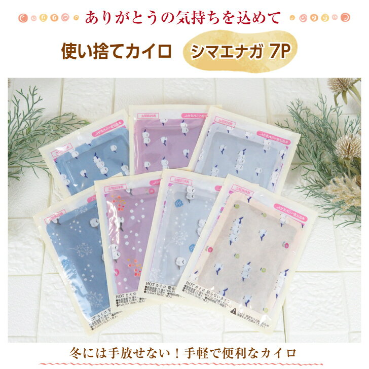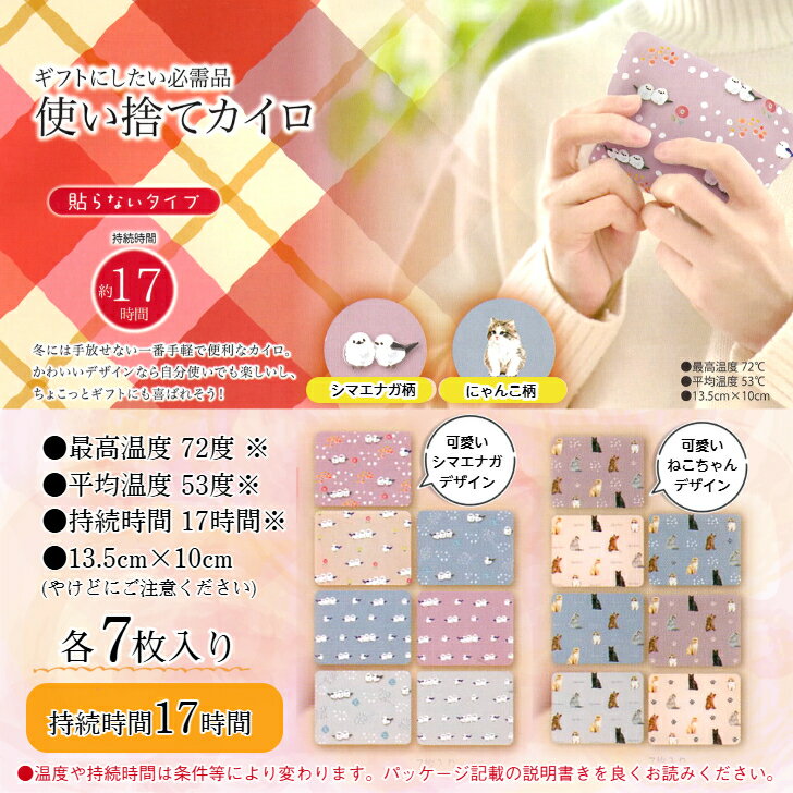 商品情報商品名ほんやら堂 使い捨てカイロ 7P(シマエナガ/ねこ)よりお選び下さい。素材鉄粉・水・バーミキュライト・活性炭・塩類、吸水性樹脂発熱時間持続時間 約17時間最高温度 約72℃平均温度 約53℃サイズ13.5×10cm使用方法・ご使用直前に袋からカイロを取り出し、軽く振ってからご使用ください。※直接肌に当てず、衣類の上からまたは、布などに包んでご使用下さい。高温になるため、やけどにご注意ください。注意・パッケージ裏に記載のご使用方法、低温やけど防止の注意、ご使用上の注意、保管方法などを良くお読みになり、正しく安全にご使用ください。・本品は食べられません。・再利用禁止。・就寝時、こたつ・寝具・電気カーペットでの使用、暖房器具近くでの使用は絶対にしないでください。発売元株式会社ほんやら堂カイロ 7Pセット 《貼らないタイプ カイロ 7枚入り (シマエナガ柄/にゃんこ柄) 》 持続時間17時間 ねこ ネコ 猫 温活 ホット リラックス ほんやら堂 『ありがとうの気持ちを込めて』のメッセージ入り 【ほんやら堂 使い捨てカイロ 7P 】かわいい癒しグッズで大人気のほんやら堂から、冬の必需品の可愛い使い捨てカイロの登場です!手軽で便利なカイロは冷える時期には欠かせないアイテム。可愛いシマエナガやねこのデザインは自分使いにはもちろん、ちょっとしたお配りギフトとしても最適です。じんわ〜りやさしい温かさが約17時間続きます。 10