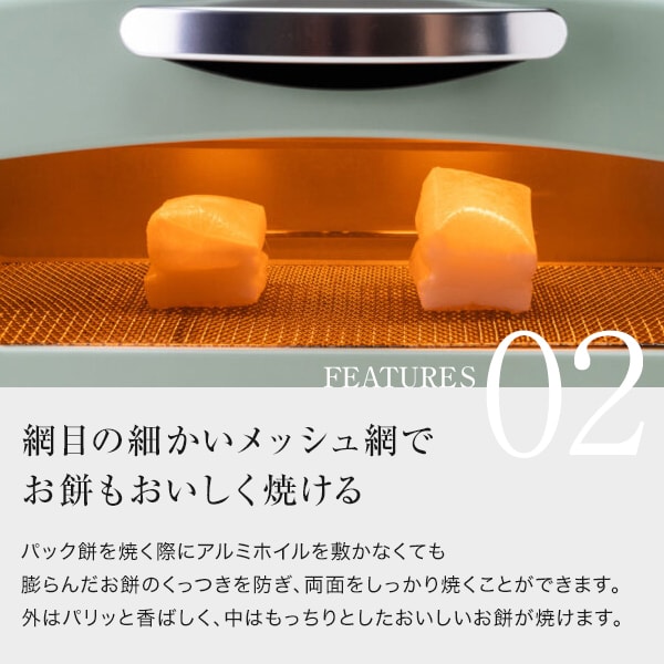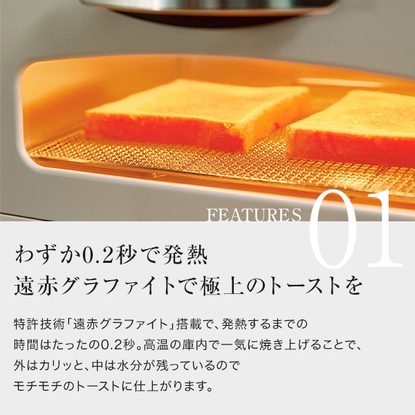 商品説明★ 特許技術「遠赤グラファイト」搭載で、発熱するまでの時間はたったの0.2秒。高温の庫内で一気に焼き上げることで、外はカリッと、中は水分が残っているのでモチモチのトーストに仕上がります。★ 網目の細かいこだわりのメッシュ網でお餅もおいしく焼けます。★ パック餅を焼く際にアルミホイルを敷かなくても膨らんだお餅のくっつきを防ぎ、両面をしっかり焼くことができます。★ 外はパリッと香ばしく、中はもっちりとしたおいしいお餅が焼けます。★ フライの温め直しも得意余分な油を受け皿へ落とし衣をサクッと仕上げます。★ 天ぷら、唐揚げ、魚のフライなど、冷めてしまった揚げ物を温め直すときは、焼き網の下に受け皿を置いてから加熱します。★ 余分な油を落として揚げたてのようなサクッとした食感をお楽しみいただけます。スペック* 本体サイズ(高さ×幅×奥行):235×350×295mm* 庫内寸法(高さ×幅×奥行):87×310×235mm* 本体重量:約3.4kg* 電源コード長:1.2m* トースター枚数:2枚* 安全装置:過昇防止サーモスタット* 火力切換機能:100℃~280℃* タイマー:15分* 消費電力:1270W* 付属品:受け皿(ホーロー)
