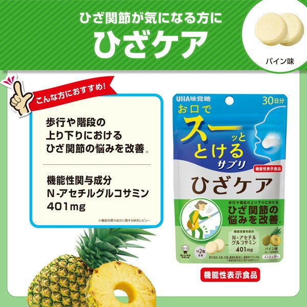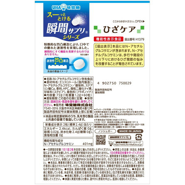 ご注文前にご確認ください※ 商品パッケージや仕様につきまして、予告なく変更されることがございます。※ 賞味期限表示がございます商品は、製造年月から表示期限までになります。商品説明★ 口の中でスーッと溶ける美味しいサプリメント[使用方法]・1日1回2粒を目安に噛んでお召し上がりください。・1日の摂取目安量を守ってください。・開封後は、チャックをしっかり閉めてお早めにお召し上がりください。・通常喫食する間食の代替としてお召し上がりください。[注意事項]・本品は、多量摂取により疾病が治癒したり、より健康が増進するものではありません。1日の摂取目安量を守ってください。・体質によってお腹がゆるくなる場合があります。・のどに詰まらせないようご注意ください。・本品は、疾病の診断、治療、予防を目的としたものではありません。・本品は、疾病に罹患している者、未成年者、妊産婦(妊娠を計画している者を含む。)及び授乳婦を対象に開発された食品ではありません。・疾病に罹患している場合は医師に、医薬品を服用している場合は医師、薬剤師に相談してください。・体調に異変を感じた際は、速やかに摂取を中止し、医師に相談してください。※メーカーの都合により、パッケージ・仕様・成分・生産国等は予告なく変更になる場合がございます。※上記理由でのご返品はお受けできませんので、事前お問合せなどご注意のほど宜しくお願いいたします。スペック* 内容量: 60粒* 2粒(標準2.4g)当たり…・エネルギー: 2.4Kcal・たんぱく質: 0g・脂質: 0.02g・炭水化物: 2.4g(糖質: 0g)・食塩相当量: 0g* 生産国: 日本【広告文責】エクスプライス株式会社 03-6632-9083【メーカー】UHA味覚糖【区分】日本製・機能性表示食品UHA瞬間サプリ【機能性表示食品】シリーズ ラインナップひざ関節の悩みを改善ひざケア食後血糖値が高めの方の血糖ケア肥満気味な方の内臓脂肪ケア