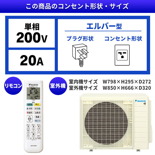 商品説明★ 全クラスで「区分(い)」 ZEHにもおすすめ!エネルギー効率を高め、冷房定格エネルギー消費効率の区分「い」を満たす能力を発揮。普及が進むZEHにもおすすめなエアコンです。★ さらら除湿(ハイブリッド方式)室温に近づけて快適除湿!温度を下げる除湿と寒くなりにくい除湿、寒くなった空気をあたためて戻す除湿などを自動的に切換え、運転はじめから室温が安定した後まで、シーンを選ばず、快適除湿を行います。★ プレミアム冷房快適な温度・しつどにコントロール。しつどをコントロールする「デシクル制御」と温度をコントロールする「ピット制御」により、設定温度に達した後も蒸し暑さを感じにくい、冷房運転をお届けします。★ 天井気流(風ないス運転)(風向上下自動 冷房/除湿運転時)エアコンの風がからだに直接あたりにくい。エアコンが吹き出した気流を上方へ持ち上げ、風がからだに直接あたりにくい快適空調をお届けします。★ 水内部クリーン(結露水洗浄)冷房運転で発生させた結露水を利用して熱交換器の汚れを洗浄。結露水で洗浄後にストリーマ照射と乾燥運転を行い、熱交換器をキレイにします。★ フィルター自動お掃除エアコンの運転終了後、自動的にフィルターのホコリをブラッシングして、ダストボックスに回収。フィルターの目づまりを抑えます。スペック* 電源:単200V 20A* 畳数のめやす…・暖房:15〜18畳( 24〜30m2 )・冷房:15〜23畳( 25〜39m2 )* 能力(kW)…・暖房:6.7( 0.6〜9.8 )・冷房:5.6( 0.6〜5.7 )* 消費電力(W)…・暖房:1580( 120〜3080 )・冷房:1720( 120〜1780 )* 消費電力量期間合計(年間):1891kWh* 省エネ基準 目標年度/達成率:2027年/88%* 通年エネルギー消費効率(APF):5.6* 室内機サイズ:高295×幅798×奥行272mm* 室外機サイズ:高666×幅850(+89)×奥行320(+66)mm* 室内機質量:12.5kg* 室外機質量:45kg【現在閲覧している商品ページはエアコン本体と標準取付工事セットの販売ページです】