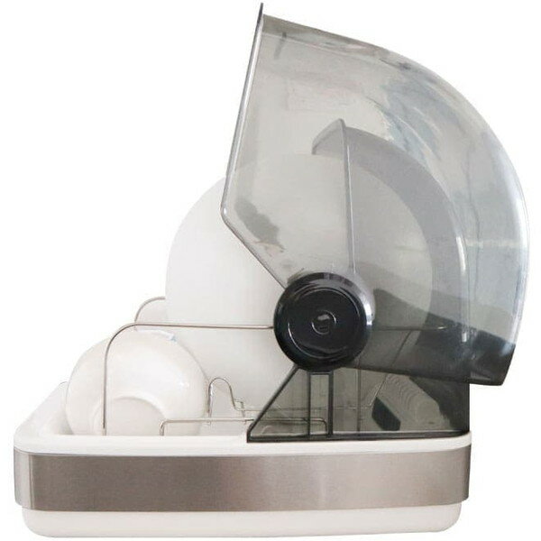商品説明★ 急速乾燥&UV除菌で素早く清潔!コンパクトな食器乾燥機とってもコンパクトな食器乾燥機が登場!シンク横に置けるスリムサイズだからとっても使いやすい♪急速乾燥&UV除菌でパリッと素早く清潔に食器を乾かします。★ 食器乾燥機で、もう水アカ知らず洗い終わった食器、どうしていますか?大半は自然乾燥という方が多いはず。でも、どことなく衛生面が気になったりどうしても水アカが残ったり…また、水筒やタッパーは水切れが悪くなかなか乾きにくかったりしますよね。洗い終わったら置くだけ!高温の温風で急速乾燥し、さらに強力UVライトでしっかり除菌して素早く食器を清潔に乾燥します。★ 設置しやすいコンパクトさコンパクトだからシンク周りに設置ができ、洗い終わったお皿をINしやすい位置に置くことができます♪また、蓋はスライド式なので開閉も片手で簡単&高さ要らず!90度までガパッと開くのでお皿の出し入れもらくらくですよ。開閉途中で手を滑らせても大丈夫!バタンと閉じることなくピタッと止まるので濡れた手でも安心です。★ たっぷり入る2人分がちょうどいい庫内はおおよそ2人分の食器を入れることが可能。大皿からお茶碗までしっかりと格納することができます。乾燥しにくかった水筒や急須、どことなく雑菌が気になりやすいタッパーなどもおすすめです。本体は電源を入れると自動的に45分で乾燥&オートオフ。消し忘れた!なんてことがないので、リビングでゆっくりくつろぐことができますね♪★ 省エネ&静音が嬉しい!なんといっても気になるのが電気代と駆動音、ですよね。しかしなんと、電気代は1回あたり(45分)たったの3円…!ヒーターものってどうしても電気代が高くなるイメージですが、しっかりと抑えることで手軽に利用できる仕様に。また、駆動音もわずか50dB。生活していても気になりにくく、静音性に優れています。注意事項※食器以外のものを入れないでください。※ご使用中においてのお客様の過失による故障、破損、改造等はサポート保証の対象外となります。※本製品は屋内専用です。※据え付けは床が上部で水平な場所に設置してください。※内容品に記載している以外の物は付属しません。※本製品をご利用において生じる物品の破損/故障は、保証の対象外となります。※正しく使用されない場合に生じた事故等について弊社での責任は負いかねます。※異常を感じたらご使用をやめてカスタマーサポートまでご連絡ください。※製品仕様は改善のため予告なく変更する場合があり、そのため説明書記載の内容と異なる場合があります。スペック* サイズ:幅225×奥行375×高さ335(mm)* 重量:約2kg* 電源:AC100V 50/60Hz* 定格消費電力:170W* ヒーター消費電力:160W* モーター消費電力:3W* 安全装置:サーモスタット、温度ヒューズ167℃* 乾燥方式:温風式* 庫内最大温度:60〜90℃(吹出し口が最大温度)* 収納皿最大直径:23cm* 動作音:50±5dB* 乾燥時間:45分(自動でオフ)* ケーブル長:約1.2m* 内容品:本体、食器かご、箸立て、日本語取扱説明書* 保証期間:購入日より12カ月