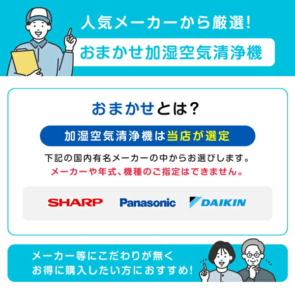 スペック・対象メーカー:DAIKIN・SHARP・PANASONIC 国内メーカーから商品を選定致します。・商品・メーカー指定は出来ません。当店での選定となります。・最大加湿量の目安:460~500ml/h・空気清浄の目安:20~23畳最大・加湿空気清浄の目安:15畳最大