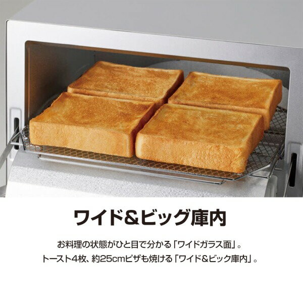 商品説明★ 熱風コンベクションヒーターの熱を庫内全体に循環させ広い庫内でも加熱ムラを抑えます。★ リベイクメニュー「リベイクメニュー」と「常温・冷凍切替」を新搭載。トースト以外のパンや冷凍パンも、焼きたてのようにあたためなおします。★ 6つのオートメニュー「トースト」、「フライ」、「そうざいパン」、「クロワッサン」メニューでは、食材の状態に合わせて常温・冷凍の切替が可能です。★ 40通りのトーストメニュー・トースト枚数:1〜4枚・冷凍切替:常温・冷凍・焼き色:5段階★ 遠赤ヒーター表面だけではなく中までしっかり加熱。加熱バランスに優れた遠赤ヒーターで、トーストは素早く、お料理も中心部までしっかり加熱して絶品仕上げに。★ 広々庫内でトースト4枚が一度に焼ける★ 30分のロングタイマー★ 直径約25cmのピザが丸ごと焼ける、幅約32.5cm「ワイド&ビッグ庫内」★ グラタンなどの調理時に便利「深皿トレイ」★ 調理時に重宝する「大きくせりだす焼きアミ」スペック* 本体サイズ(約):幅37.7×奥行38.5×高さ24.5cm* 庫内有効サイズ(約):幅32.5×奥行26.0×高さ10.0cm* 重量(約):5.1kg* 消費電力:1312W(ヒーター:1300W・ファン:12W)* トースト枚数:食パン4枚* ヒーター上部:遠赤ヒーター* ヒーター下部:石英管ヒーター* 温度調節:約80度〜250度* タイマー:30分* コード長:約1.2m* 付属品:深皿調理トレイ