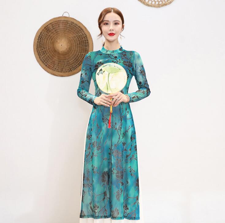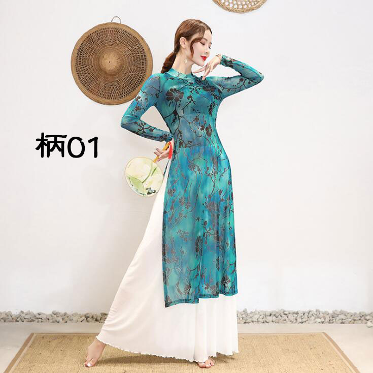 中華風ダンスウェア 長袖ダンス衣装 レディース レッスン着 ダンス練習着 ダンス発表会 エスニック 古典ダンス 花柄ダンストップス ダンスパンツ ワイドパンツ ダンス教室 ダンス授業 3色