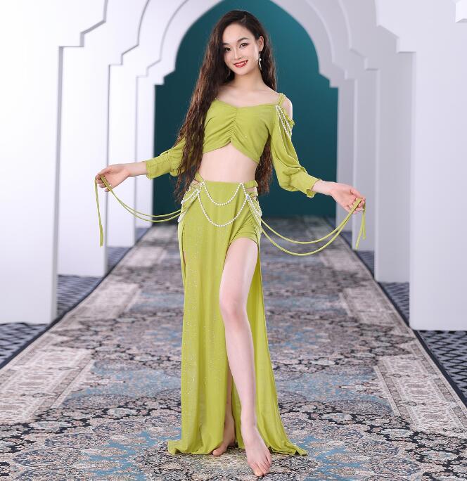 長袖ベリーダンス 衣装 スカートセット へそ出しTシャツ ラメ入り ロングスカート スリット入り ベリーダンス 演出服 セクシー レッスン着 発表会 ベリー衣装 おしゃれ