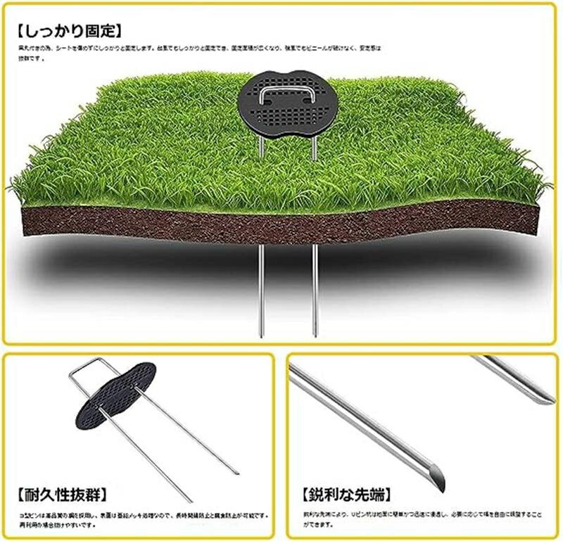 防草シート、人工芝、農業用防虫ネット、 不織布、ビニールマルチ、各種シート・マット等を 地面に設置・固定できるU字型ピンの商品です。 U字型のピンを黒丸の穴に差し込みご使用下さい。 丸付きの為、シートを傷めずにしっかりと固定できます。 ご注意:シートに刺さりやすいように、 先端を尖らせていますので使用には注意してください。 材質:ピン:錆防止亜鉛メッキスチール製 黒丸:ポリエチレン製 黒色 【数量】200本 サイズ:15cm×4cm×厚み3mm