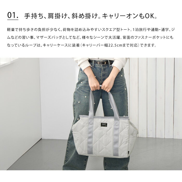 商品スペック 特長 軽量で持ち歩きの負担が少なく、荷物を詰め込みやすいスクエア型トート。1泊旅行や通勤・通学、ジムなどの習い事、マザーズバッグとしてなど、様々なシーンで大活躍。背面のファスナーポケットにもなっているループは、キャリーケースに装着(キャリーバー幅22.5cmまで対応)できます。体に寄り添うやわらかさがありながら、自立するシルエット。13インチPC、A4サイズの書類などがすっぽり入り、ダブルファスナー開閉でガバっと開き、はっ水加工で汚れにくく雨の日も安心。 サイズ・重さ (約) W37×H29×D16cm/560g 持ち手:55cm/ショルダー紐:最長140cm 素材 表地:ポリエステル(はっ水加工) 裏地・持ち手:ポリエステル 留め具:マグネットホック 注意事項 ※モニターなどの関係により実際の商品の色と多少異なる場合がございます。予めご了承下さいませ。 ※北海道、沖縄、一部離島は別途送料が必要となります。詳細はショップガイドをご確認くださいませ。