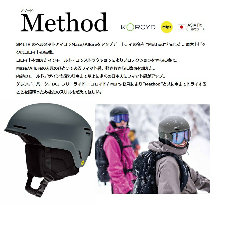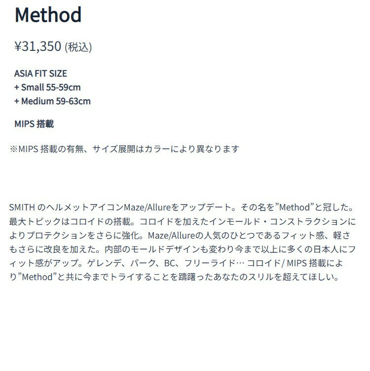 SMITH のヘルメットアイコンMaze/Allureをアップデート。その名を ”Method”と冠した。最大トピックはコロイドの搭載。 コロイドを加えたインモールド・コンストラクションによりプロテクションをさらに強化。 Maze/Allureの人気のひとつであるフィット感、軽さもさらに改良を加えた。 内部のモールドデザインも変わり今まで以上に多くの日本人にフィット感がアップ。 ゲレンデ、パーク、BC、フリーライド… コロイド/ MIPS 搭載により”Method”と共に今までトライすることを躊躇ったあなたのスリルを超えてほしい。 PROTECTION + 軽量インモールド構造 + Koroyd マテリアルを使用したエアロコア・コンストラクション + 8個のベンチレーションホール装備 + MIPS搭載 FIT + 自動調整ライフスタイル・フィットシステム搭載 + AirEvac ベンチレーションシステム + 取外し可能イヤーパット + 脱着可能ゴーグルロック US SIZE: + Medium 55-59cm + Large 59-63cm Asia Fit SIZE: + Small 55-59cm + Medium 59-63cm + Large 63-67cm CERTIFICATION: ASTM F 2040, CE EN 1077:2007 CLASS B WEIGHT (SIZE M) : 450g サイズ展開、USFITまたはASIAFITは各カラーにより異なります。 各カラー下部をご参照ください。 --------------------------------------------------------------------- 安心の日本国内正規品