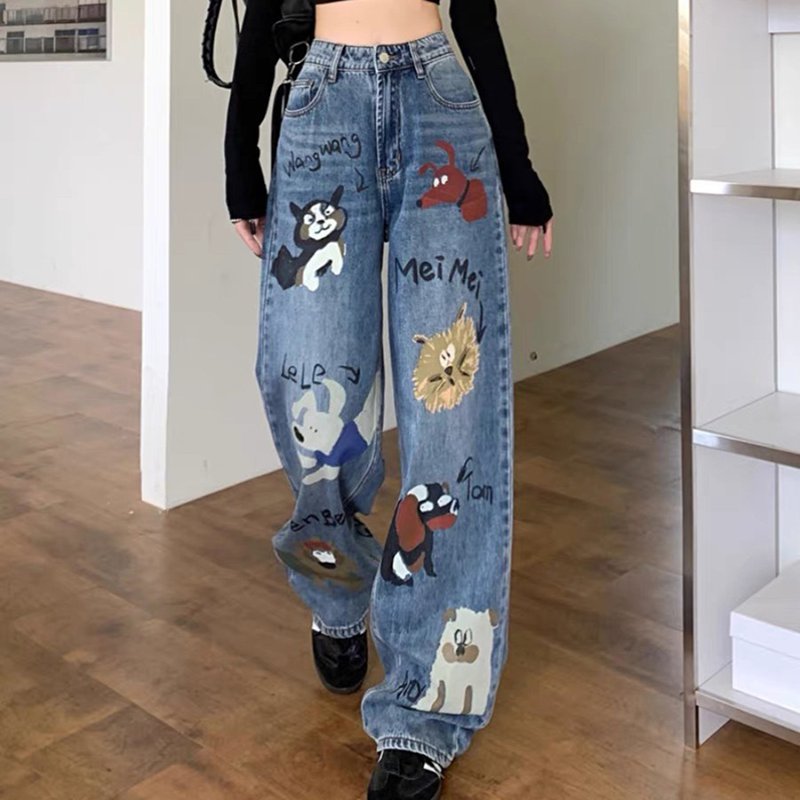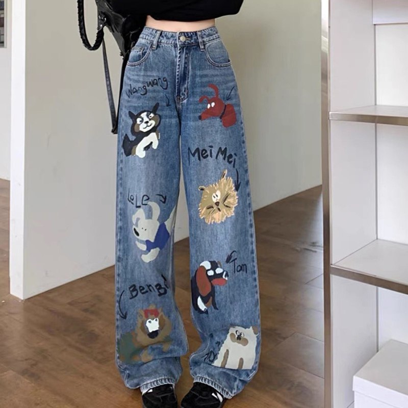 デニムパンツ ワイドパンツ 犬柄プリント レディース かわいい ワンちゃん ロングジーンズ ルーズシルエット おしゃれ 着回し力ピカイチ ファッション 四季 カジュアル 街着 外出 デイリー