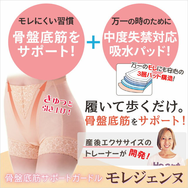 ■こちらの商品は、商品代引でのお支払いはできません。 ■クリックポストでの発送となります。 骨盤底筋サポートガードル「モレジェンヌ」 素材 【身生地】 綿:95%、ポリウレタン:5% 【レース】 ナイロン、ポリウレタン サイズ L:ヒップ92~100cm カラー ベージュ/ラベンダー/モカ 原産国 中国 【着用方法】 1.ウエストまで引き上げ、お腹まわりをしっかりフィットさせます。 2.ウエストから手を入れて、お尻のお肉を持ち上げ、ヒップの位置を整えます。 3.後ろから見たときにヒップがしっかりとショーツに入り、太ももヒップの境目ができているきているか確認してください。 ■ご注意 ◇吸水量が一定量を超えた場合や、一箇所に水分が集中した場合は、吸水シートののふちや縫い目から漏れ出す恐れがありますのでご注意ください。 ◇使用中、使用後、お体に異常が見られる場合はただちに使用を中止して医師にご相談ください。 ◇妊娠中、または妊娠の可能性のある方はご使用をお避けください。 広告文 : 株式会社エイブリー TEL:0120-797-866 製造元 : 株式会社ドリーム 区分 : 日本 下着 モレジェンヌ 販売ラインアップ ベージュ(M・L・LL) ラベンダー(M・L・LL) モカ(M・L) 2枚セット(Mサイズ) 2枚セット(Lサイズ) 2枚セット(LLサイズ)産後の筋力トレーナーが開発! 骨盤底筋サポートガードルで、 モレにくい習慣を。 骨盤底筋サポートガードル「モレジェンヌ」は、ハンモック状の引き上げネットが、骨盤底筋にフィットしサポートします。 中度失禁対応の吸収パッドが、万一のモレにも対応。 さらにしっかりカラダにフィットする立体裁断で、履き心地にもこだわりました。レースをたっぷり使ったおしゃれなデザイン! 履いて歩くだけ。 骨盤底筋ケア+「もしも」の時のモレ対策! 骨盤底筋サポートガードル「モレジェンヌ」は、内側のハンモック状引き上げネットで、底筋をキュッと引き上げ。モレにくい習慣をサポートするショーツです。吸水パッドで万一の軽いモレにも対応! ◆骨盤底筋をサポート! ショーツの内側に独立して付けられた薄型ハンモック状引き上げトレーニングネットが、骨盤底筋をきゅっとサポート。 ◆安心の3層構造。吸水パッド! 三層構造の吸水パッド付きなので、まさかのモレにもしっかり対応。 中度失禁対応の吸水パッドでお出かけのときも安心! ◆カラダにフィットする快適な履き心地! ヒップラインや腹部にあわせた立体裁断で、カラダにフィットし、くい込みにくいショーツです。 産後エクササイズのプロが開発! 骨盤底筋サポートガードル「モレジェンヌ」は、産後エクササイズパーソナルトレーナーの照井敦子先生監修のショーツです。 産後エクササイズパーソナルトレーナー 照井敦子先生 現在、出張パーソナルトレーニングをメインにフリーで活動。女優、アナウンサー、モデル、実業家など著名人を含む350名以上を担当した実績があります。 ●骨盤底筋をケアすることが大切! 「生殖器を支える重要な役割をしている骨盤底筋は、意識して動かしにくく、出産や加齢を機にゆるみやすい部位です。放置したままでは回復できませんが、サポートすればOK。まずはガードルで引き上げることでケアを。骨盤底筋を締めれば、ぼうこうや子宮が正しい位置でキープされ、尿モレなどの女性のトラブルも改善されます。」 ●骨盤底筋とは 骨盤底筋(群)とは、骨盤の恥骨と尾骨の空間にハンモック状に張られた筋肉 です。骨盤の底で、膀胱や子宮、直腸などの臓器を受け止めています。 この筋肉が衰えると、膀胱や尿道を支えきれなくなり、腹圧性(お腹にチカラがかかったとき)の尿もれの原因となります。 ■ 骨盤底筋と内股を鍛えるエクササイズ■ こちらは【Lサイズ】のページです。他サイズは下記リンクよりご購入ください。 Mサイズ | LLサイズ