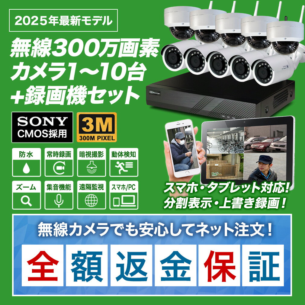 【今だけ楽天ポイント5倍!11/27まで】防犯カメラ 屋外 ワイヤレス 無線 カメラ 1台 2台 3台 4台 5台 6台 7台 8台 9台 10台 選べるセット 車上荒らし 最大100メートル無線可能! 屋内 WiFi 監視カメラ 出先からスマホで見れる ネットワークカメラ 300万画素 WL-830R_1-10