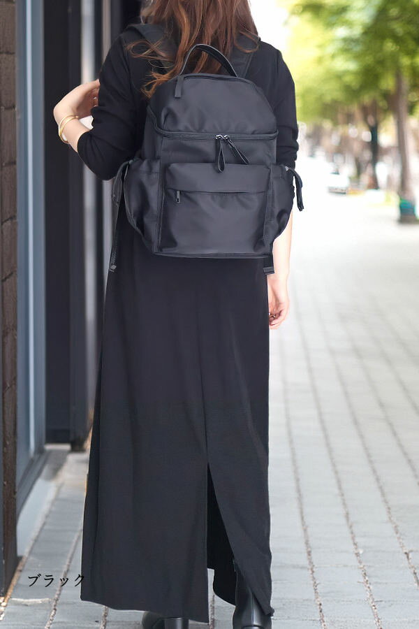 グランデグレイス/grandegrace 大人のリュックの新時代 フラップポケットリュック 大きすぎない、ジャストなサイズ感の 撥水加工ナイロン素材で仕上げたリュック 大きく開くフラップ、マチが大きく 見た目以上の収納力が期待できます。 グランデグレイスが新しくご提案したいのは "新時代型フラップポケット" フラップの部分は全部ポケットに!! 中のものが、落ちたりしないように 少し間口を狭く設計しました。 メイン収納とは別の収納となり、整理整頓も◎ 約515gの軽量設計 インナーもキレイな"大人のブルーグレー"を採用 通勤やショッピングのデイリーにも アクティブな1日の旅行など 大きすぎない、ジャストサイズのリュックです。 1.立体フラップポケット メインルームと別にサブルームのようなフラップポケット 満員電車の膝の上でも出し入れしやすい フラップに設置しました。 2.9つのポケット 立体フラップポケットも含む9つのポケットを設置 3.キレイ色インナーカラー 大人可愛いブルーグレー 4.大きく開くメインルーム 中身が一望出来る 5.マテリアル 撥水加工高密度ナイロン 6.幅広肩ラクショルダーベルト 7.キャリーオンベルト 使わない時は留めておけるスナップボタン付 Detail color variation ブラック 一般的なブラックです。 インナー:ブルーグレー パーツ:マットブラック ご紹介アイテム