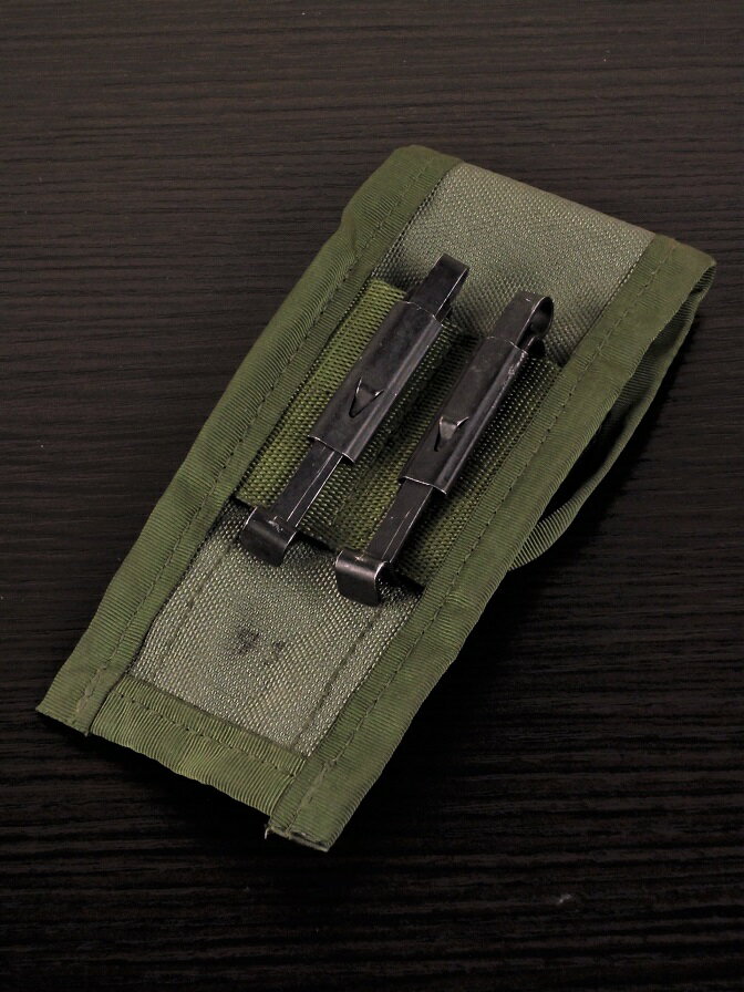 M-9ポーチのデッドストックの、お得な3個セットです! 商品説明 特徴 M-9マガジンポケットがデッドストックで入荷しました。 ベレッタ用9mmマガジンを一つ収めることが出来る防水加工がされたナイロンポーチで、かつてはミリタリーショップの定番的なアイテムでしたが、最近は放出も少なくなり、一部ではちょっとしたビンテージ扱いになりつつあります。 プライスもユーズドで千円前後、新品では二千円前後はしているのではないでしょうか? 立体成形されたベルクロ留めのモデルでは、お気に入りのファッションにマッチしないという方も多いと思います。 この機会に是非どうぞ。 背面に付いている二個のスライドキーパーでベルトに装着することが可能です。 フォールディングナイフやマグライト、縦長のライターなんかを入れるのにも最適ですよ。 *こちらは、大変お得な3個セットです。 プライスは3点での表記となっております。 さらにお得な6個セットは コチラから どうぞ。 素材、色 ナイロン素材 グリーン サイズ 全長(オープン時):約25cm, 全長(クローズ時):約15.7cm, 幅:約6.8cm コンディション 新品(未使用、デッドストック) 注意 画面上と実物では多少色具合が異なって見える場合もございます。 同じくアーミーグリーンではございますが、個体によりカラーのトーンが異なっていたり「US」印字の字体や大きさが異なっている場合がございます。 フラップ裏のスペックは防水用のラミネートの上にスタンプされていますので、経年により滲んで殆ど読めない個体も多々ございます。 大半は1996年から2001年コントラクト分となりますが、商品の特性としてご理解いただきますようお願いいたします。 スタンプのかすれや経年したナイロン製品特有のにおいがある場合がございます。 複数個お買い求めいただいた際には、トーンや印字等が異なる個体のミックスとなる場合がございます。