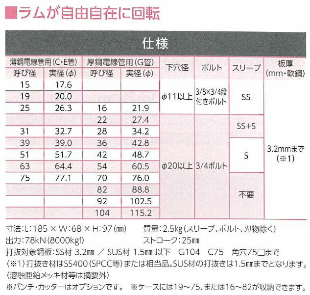 【特長】 ●マルチ工具用アタッチメントシリーズ ●本製品はEV-150(DX)シリーズには対応しておりません。 ※ 打抜き材はSS400相当品、SUS材の打抜きは1.5mmまでとなります。 ※ 角穴は75□まで。 ●標準付属品 本体 アルミケース ボルト 3/8×3/4、3/4 パンチスリーブ (2ケ) ※パンチカッターはオプションです。 ・ケースには19〜75、または16〜82が収納できます。 販促キーワード;圧着 コードレス 軽量 T型 アタッチメント 六角 油圧 コンパクト 軽量 土木 電設 変電 水道 通信 安価 現場 最新 業務用 本格 強力 学校 屋根 屋上 安価 最安値 激安 押ダイス 受ダイス EV-250DL EV-325DL EV-60DL EV-250AH EV-325AC CCH-460A CCH-560A EVS-12 EVD-16 CRC-100 CRC-70 EV2-T240 EVT-122 EVF-100 EVC-T122 EVRP-40 EVR-40W EVR-2D EV2-AKC EV2-AKV EV2-AKB EV2-AKP EVK-4 SEP-12 SEP-30DX SP-2S-150E S-60Ei SH-250M SS-325H EW-8DL CT-8 CT-700 EX-3250L CC-325 CC-520 CC-3 SKP-4 SLP-4 SLP-4TW パイプベンダー ハイドロパンチャー ドラムローラーユニボーラー アンカーテスター アングル加工 鉄筋カッター 全ネジカッター ベンダー 銅線用圧縮工具 ケーブルラックカッター 電動工具 圧縮工具 コードレスパンチャー T型コネクター Tコン C型コネクタ- Cコン 圧着端子 圧縮端子 油圧シリンダー 薄鋼電線管 厚鋼電線管 角パンチカッター カプラー カップラー 油圧 圧着 工具 中古 カクタス ダイス 充電 圧着工具 アタッチメント収納ケース