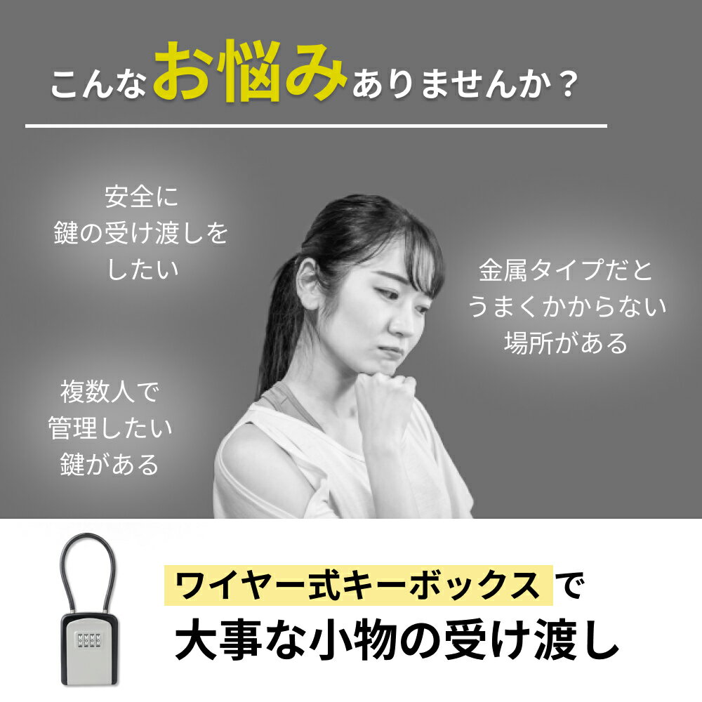 【楽天ランキング 6冠達成 】キーボックス 屋外 ダイヤル式 壁掛け 玄関 ホームセンター ワイヤー 南京錠 防水 セキュリティボックス 鍵収納 大容量 ブラック グレー キー ボックス 鍵ボックス 小型 コンパクト 鍵の受け渡し 鍵保管 ダイヤルロック 鍵ボックス 簡単操作 頑丈 ワイヤー タイプの キーボックス です。ワイヤータイプ なら少しの隙間でも簡単に装着し鍵などを安全に受け渡しできます。金属のU字タイプに比べ設置できる場所が多くなるため汎用性は高いです。素材は高耐久のアルミニウム合金を採用。重さもあり堅牢性に優れ、衝撃にも強く耐久性もあります。屋外の雨や風にも強く、気にせずご利用頂けます。■安心のセキュリティダイヤルロック式なのでご自身でロックナンバーを決めることができます。4桁のダイヤル式なので約10,000通りの暗証番号となるため、防犯対策も万全。また暗証番号は好きな時に変更することも可能です。鍵だけではなくカードキーやUSBメモリ、印鑑などボックスに入るものであれば受け渡しにご使用頂けます。■注意事項・簡易包装での発送となります。海外輸入品のため、多少のスレや汚れなどがある場合がございます。・サイズは、多少の誤差が生じる場合がございます。・モニター環境により、実際のものと素材感・色が多少異なって見える場合がございます。・メーカーの商品改良のため、予告なく仕様が画像と若干変更になる場合がございます。 5