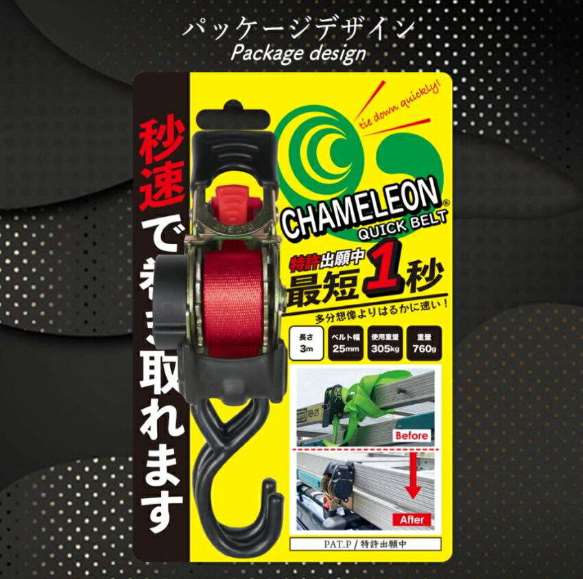 荷締めベルト カメレオン クイックベルト ラッシングベルト 自動巻き取り ベルトの長さ3m ベルト幅25mm 重量760g 使用荷重300kg トラック荷台