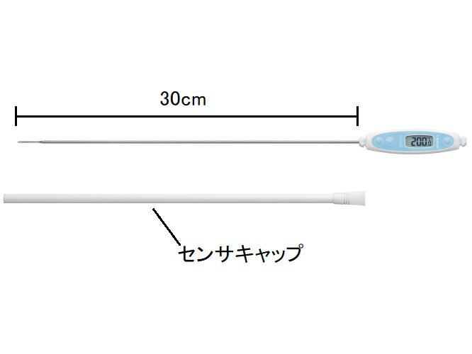 仕様 測定範囲:−50.0〜240.0°C 測定精度:±0.7°C(−10.0〜100.0°C) ±1.2°C(−20.0〜−10.1°C、100.1〜200.0°C) ±2.0°C(200.1〜240.0°C) ±2.5°C(−50.0〜−20.1°C) 分解能:0.1°C サンプリング:約2秒 表示機能:最高温度(MAX)、最低温度(MIN)、ホールド機能(HOLD)、LCD表示反転 オートパワーオフ機能:約10分間ボタン操作がないとき、自動的に電源が切れます 防水性能:JIS C 0920 IPX7に準拠 使用環境:0〜40℃ 90%rh以下(結露なきこと) 電源:ボタン電池 LR44 2個 電池寿命:約7ヶ月(1日10分使用時) 材質:本体部(ABS樹脂)、感温部(SUS304)、センサキャップ(ABS樹脂) 寸法:本体 約(L)393×(W)23×(D)23mm(感温部含む) 感温部 約φ1.5×(L)18mm+φ2.5×(L)281mm 先トガリ 質量:約30g(電池含む) 付属品:センサキャップ(1個)、ボタン電池 LR44(2個)、取扱説明書(1枚)特長 ■ JIS C 0920 IPX7に準拠 水がかかる場所でも使用可能な防水型デジタル温度計です。 流水での丸洗いも可能なため、衛生的です。 ■ 高速応答タイプ 感温部(センサパイプ先端)がφ1.5と極細のため、測定した温度値に素早く応答します。 ■ 約30cmの長いセンサ部 感温部が約30cmと長いため、寸胴鍋などの深い位置の測定ができたり、揚げ油での測定では離れた位置から測定ができるので火傷防止にも役立ちます。 ■ 表示反転機能(180度表示反転) 表示部反転機能で左右どちらの手で持っても見やすい向きに切り替えられます。 (切り替えはボタン操作でおこないます。) ■ 最高値・最低値表示 ボタン操作で、最高温度・最低温度を表示します。 最高温度(MAX)、最低温度(MIN)は以下のときにクリアされます。 ・電池を抜いたとき ・最高値または最低値を表示しているときに「MAX/MIN」ボタンを5秒以上押したとき ■ 測定値のHOLD機能 測定した温度値を固定表示します。 (固定表示はボタン操作でおこないます。) ■ オートパワーオフ機能 約10分間ボタン操作がないとき、自動的に電源が切れます。 説明 ■ 正しい温度測定をおこなうには、センサが周辺温度の影響を受けないよう測定対象物に感温部を挿入してください。 「(感温部直径×20倍の長さ)以上 ※φ1.5の場合、30mm以上」 ■ 安全に使用するために センサキャップは保管の際に感温部を保護するためのものです。 持ち手として使用しないでください。 本体が外れて落下したり、センサキャップが破損したりする恐れがあります。