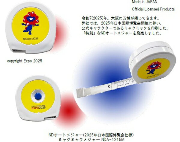 「2025大阪・関西万博公式ライセンス商品」は、ライセンス契約に基づいて製造されており、売り上げの一部は、本万博のために活用されます。 ●令和7(2025) 年。大阪に万博が帰ってきます。 ●2025 年日本国際博覧会開催に伴い、公式キャラクターであるミャクミャクを印刷した、「特別」なND オートメジャーを発売しました。 【仕様】 ●全長:1.5m ●テープ材質:ガラス繊維 ●重量:43g ●巻取ケース;ABS樹脂 ●テープ巾:12mm ●先端ツマミ:POM樹脂 ●目盛仕様:片面印刷・1mm目盛