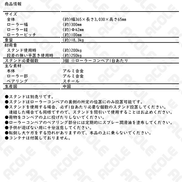 アルミローラーコンベア ARK-3M ※法人限定のため、下部「必ずご確認ください」の内容を必ずご確認ください。 商品情報 【品番】 ARK-3M 【サイズ】 全体:(約)幅36.5×長さ303×高さ6.5cm ローラー幅:(約)30cm ローラー経:Φ4.2cm ローラーピッチ:10cm 【重量】 (約)18.3kg 【耐荷重】 スタンド使用時:(約)200kg 段差の無い平置き使用時:(約)250kg 【スタンド必要個数】 3個 ※「ARK-3M」1台あたり 【主な素材】 本体:アルミ合金 ローラー部:アルミ合金 ベアリング:スチール 【生産国】 中国 採集コンテナや段ボール等の箱をスライド移動。 【商品に関する注意点】 ●スタンドは別売りです。 ●スタンドはローラーコンベアの裏側の所定の位置にのみ設置可能です。 ●必ず1台あたり必要な個数のスタンド設置してください。連結した場合でも同様ですので、スタンドを間引いて使用することはお止めください。 ●荷物をコンベアの上に投げたりしないでください。 ●ローラーコンベアのベアリング部分には定期的にスプレー潤滑油を塗布してください。 ●子供が遊ばない用に十分注意してください。 ●転倒し大ケガをする恐れがありますので、本品の上に乗らないでください。 ●コンテナは付属しておりません。 ●商品仕様はメーカー発表を基にしています。 ●本来とは異なる方法や用途以外で使用したり改造したりするなどせず、正しく使用してください。 ●商品仕様は改良のため予告なく変更される場合があります。 ●画像はご覧頂く環境(ディスプレイやご利用端末の違い、設定など)や撮影時の角度や光の当たり具合などにより、実際の色味と異なって見える場合がございます。 ●こちらの商品はメーカーの在庫を共有しており、メーカー側の在庫更新のタイミングによっては実際には在庫切れとなってしまっているという場合があります。その場合やむを得ずキャンセルさせて頂く場合があります。 上記につきまして予めご理解ご了承頂きますようお願い申し上げます。 【関連商品はこちら】 ※お買い間違いには十分ご注意ください。お間違いによる返品・交換のご希望は承れない場合があります。 【通常販売ページ】 ※全ての方を対象とした販売ページです。 現在通常販売は行っておりません。 【法人様用販売ページ】 ※法人限定価格の販売ページです。 ※宛名または送付先住所に法人様名が無い場合は販売不可のためキャンセルされます。 ■アルミローラーコンベア 1m (ARK-1M) 2m (ARK-2M) 3m (ARK-3M) ■アルミローラーコンベア90度カーブ ARKC-1990R ■アルミローラーコンベアスタンド ARKS-12 (旧ARKS-4361) ※この商品のスタンドは「アルミローラーコンベア用スタンドセット ARS-62100」のスタンドとは異なります。お買い間違いの無いようご注意ください。 ■アルミローラーコンベア用スタンドセット ARS-62100 ※この商品のスタンドは「アルミローラーコンベアスタンド ARKS-12 (旧ARKS-4361)」とは異なります。お買い間違いの無いようご注意ください。 アルミローラーコンベア 連結可能 ストレート 運搬器具 物流器具 物流機器 運搬用品 作業用品 アルミ製ローラーコンベア 連結式アルミローラーコンベア 連結式アルミ製ローラーコンベア 運搬補助器具 作業補助器具 必ずご確認ください 【地域限定販売について】 ご注文いただけない送付先地域があります。 【注文受付不可地域】 ※該当地域は後ほどキャンセルとなりますので、ご注文前に必ずご確認ください。 【法人限定販売について】 宛名または送付先名で法人様であることが確認できない場合はご注文を承れません。 ※宛名または送付先名で法人様であることが確認できない場合はご注文をキャンセルさせていただきます。 ※宛名や送付先住所に法人名の記載があっても配送先が一般の住宅・建物ですと、配送会社が配送時に法人ではないと判断し配達を拒否されます。その場合、お荷物は配送会社の配達店舗にて一時預りとなった後、保管期限を過ぎますと当店へ返送となります。 ※法人か一般の住宅・建物かの判断は配送会社のルールで定められているため、この判断に当店が関与することは一切できません。 ※配達不可と判断され配達店舗での一時預りとなった場合、当店から別の配送会社に変更する、当店従業員が代わりに配送を行うといった代替対応は一切承っておりません。お客様ご自身で配達店舗へご連絡いただき、配達店舗にて荷物の引き取りを行ってください。また、引き取りにあたって「軽トラックなどをレンタルしなければいけなくなった」などといった商品購入代金とは別で発生した金銭を含む全てのご負担について、当店は一切責任を負いかねます。 ※返送となった場合、その時点で楽天市場のシステムにてキャンセルの手続きを行われますので、ご注文内容の復元はできません。そのため、返送された商品を別の配送会社へ変更し、再度発送をするといった対応は一切承りません。 ※お荷物の引き取りがなく返送となった場合、お客様都合のキャンセルの処