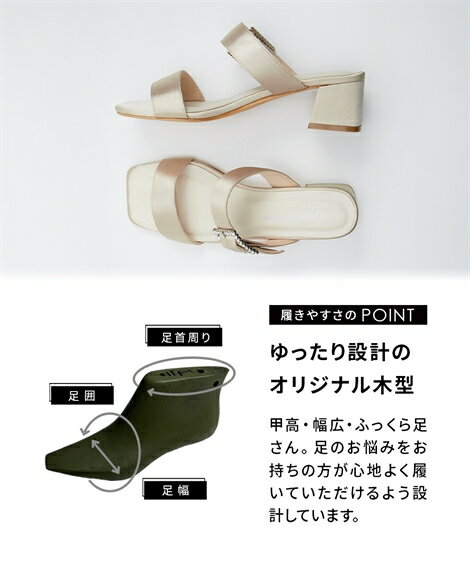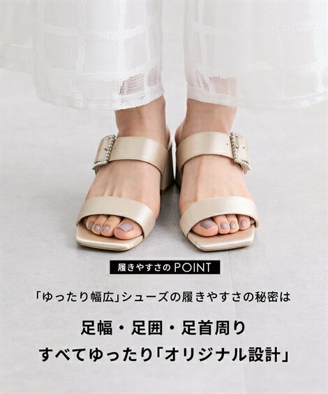 ▼当店の幅広シューズについて 詳しくはこちら靴 4E 幅広 ゆったり ワイド 大きいサイズ レディース スクエアトゥ ベルトサンダル バックル ビジュー ストーン チャンキーヒール (アクアカルダ) 黒(サテン調) シャンパン(サテン調) 黒(スムース) カラー黒(サテン調) シャンパン(サテン調) 黒(スムース) サイズM・23.0~23.5cm/4E L・24.0~24.5cm/4E LL・25.0~25.5cm/4E 3L・26.0~26.5cm/4E 素材 材質=合成皮革・合成繊維 底材=合成底 底の厚さ(後)=約5cm ワイズ=4E 重量=約250g(Lサイズ片足) ※生産時期や素材などによって多少個体差があります。 原産国 中国 商品番号 ZZY4L25B0187 コメント ビジュー付きのバックルがキラリと光るサンダル。スクエアトゥとチャンキーヒールできれいめに寄りすぎず合わせやすい印象。太めのヒールは安定感も抜群です。屈曲性が良く足の動きに馴染んで歩きやすい。ビジュー付きのバックルが華やかなデザイン。地面との接地面が大きく安定感のあるチャンキーヒール仕様です。甲高、幅広、ふっくら足さんなど、足のお悩みをお持ちの方に心地よく履いていただけるサンダルです。 ■オリジナルの大きいサイズ規格 本当に合う靴に出会った事はありますか?当店の4Eは、靴底の幅を広げ、甲や足首周りもゆったりの独自設計。靴のサイズにお悩みのお客様へ向けて、サイズが大きくてもバランス良くきれいに見えるよう企画したオリジナルシューズです。