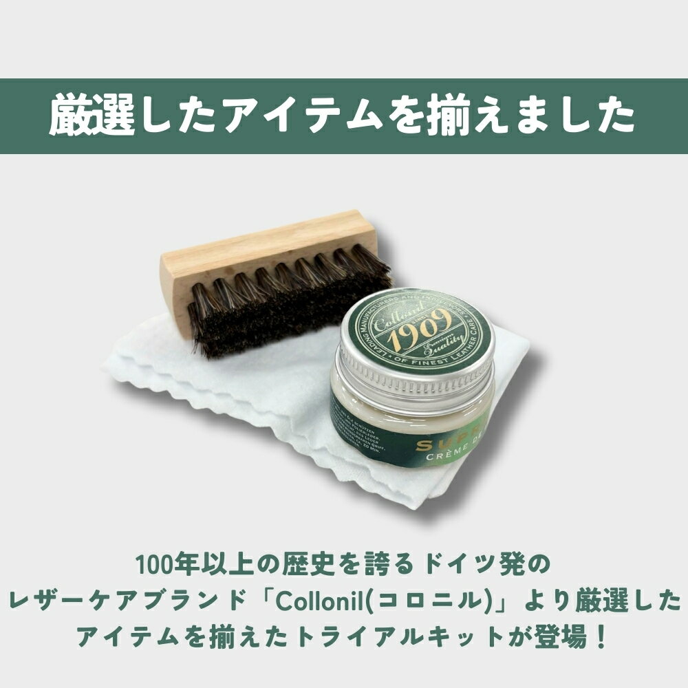 商品説明 名称 コロニル Collonil 1909 トライアルキット お得なセット内容 ■1909シュプリームクリームデラックス20ml(カラーレス) ■馬毛極小ブラシ ■ミニポリッシングクロス 特徴 ■ミニサイズの1909シュプリームクリームデラックス、馬毛小ブラシ、豚毛小ブラシ、そしてお手入れに欠かせないポリッシングクロスが入った特別なセット ■コンパクトだから外出先でのケア用にも ■ご自分へのご褒美や大切な方への贈り物にもぴったりなセットです。 使用方法 ■馬毛ブラシやクロスで革表面のホコリや汚れを払います。 ■クリームをクロスに少量取り、皮に塗布します。塗りすぎないように注意し、足りない部分には必要に応じて塗り足します。 ■クロスで乾拭き、馬毛ブラシでブラッシングをして仕上げます。 主要成分 ■1909シュプリームクリームデラックス:シーダーウッドオイル・ラノリン ■馬毛小ブラシ:毛:馬毛 / 本体:ブナ ■ポリッシングクロス:コットン100% 対象素材・製品 スムースレザーの靴、バッグ、ウェア、家具等、ヌメ革、ラム・シープスキン、エナメル皮 ※有機溶剤は使用しておりません。 ご注意 パッケージやロゴデザインは予告なく変更される場合がございますが製品自体には何の変更もございません。 商品ページと実際の商品が異なる場合でも、返品・交換は承りかねますのであらかじめご了承下さい。 おすすめアイテム ・コロニル スタート表革シューケアセット ・コロニルシュプリームクリーム&馬毛ブラシセット ・コロニル1909シュプリームシューケアセット ・コロニル1909シュプリームセット ・コロニルシュプリームクリームセット ・コロニル1909シュプリームプロテクトスプレー2本SET