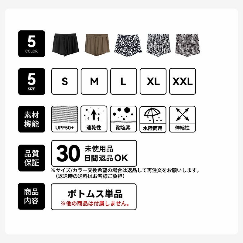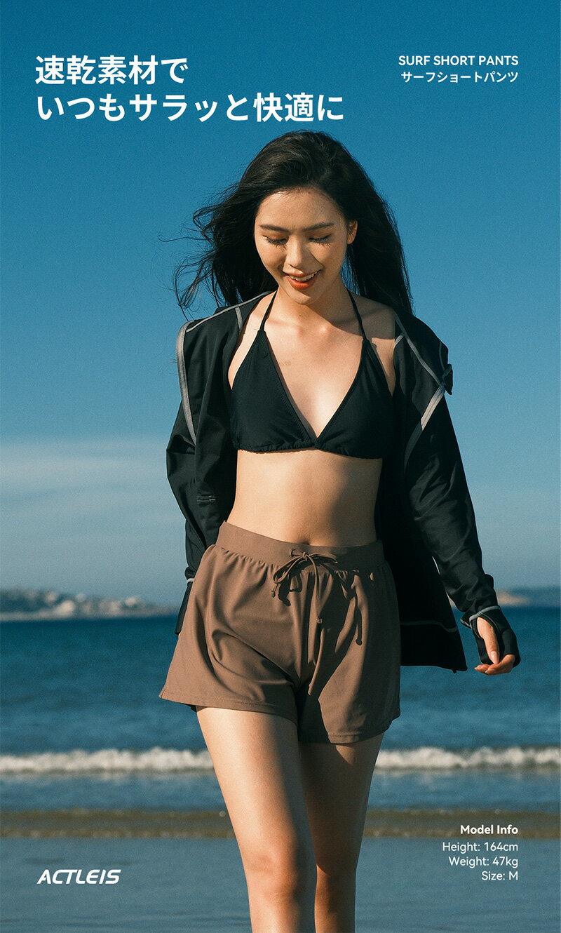 ※お客様のモニターの環境によって色が異なって見える場合がございます。 【商品名】 水着 パンツ ショートパンツ レディース サーフパンツ サーフショーツ ボードショーツ 海パン ハーフパンツ こちらの商品は「ボトムス単品」です。 ※他の商品は付属しませんのでご注意ください。 【ブランド名】 Actleis アクレイス 【商品コード】 al24010 【商品説明】 UPF50+で紫外線をカット 5色から選べる豊富なカラーバリエーション 海やプールなどの水遊びからタウンユースまでOK 速乾性に優れた素材なので不快感なく着用いただけます。 【商品カテゴリ】 マリン>水着>レディース水着>ショート丈 【カラーバリエーション】 ブラック、ブラウン、ホワイト 【サイズ展開】 S・M・L・XL・XXL 【関連用語】 単品 ラッシュガード 大きいサイズ 体型カバー ショート ミドル プール 海 海水浴 サーフィン ヨガ おしゃれ 水陸両用 吸水速乾 耐塩素 uvカット 10代 20代 30代 40代 50代