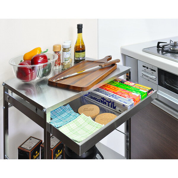 ステンレス移動キッチン作業台 幅50 「毎日使いたくなる、シンプルで高機能なステンレスキッチンワゴン」 キッチンをもっと快適に、効率的に。ステンレス素材を使用したキッチンワゴンは、耐久性抜群で長年ご使用いただけます。日々の忙しいキッチン作業をサポートし、必要なものをすぐに取り出せる収納力を提供。 お手入れ簡単、いつでも清潔に ステンレスの特長で、汚れが簡単に落ち、衛生面でも安心。毎日の料理後も手間をかけずにきれいな状態を保てます。 長く使える信頼の一台 丈夫で使い勝手の良い設計だから、何年経っても新しいように活躍し続けます。無駄な買い替えを避け、手に取るたびにその価値を実感できます。 キッチンの整理整頓が楽になり、スペースも有効活用できるので、毎日の料理がもっとスムーズに。長く愛用したくなる、そんなワゴンです。 → 組立説明書をダウンロード 商品スペック サイズ 【本体】 約幅50×奥行38×高さ85.5cm 【天板】 約幅48×奥行35cm 【引き出し有効内寸】 約幅40×奥行32×高さ7cm 【中棚・下棚】 約幅44.5×奥行34.5cm 【梱包時】 約82×37×11cm 重量 約6.5kg (梱包時:約7.5kg) 耐荷重 天板: 約10kg 中棚: 約5kg 下棚: 約10kg 引き出し: 約2kg 付属品 キャスター×4個 (内、2個はストッパー付き) 材質 本体:ステンレス フレーム:スチール/クロムメッキ 必要な工具 プラスドライバー 備考 お客様組立品(大人2人で約20分)日本製(足立製作所) ▼ 関東・関西エリア限定 ▼こちらのページは【幅60cm】となります。 ▼ 関連商品 ▼