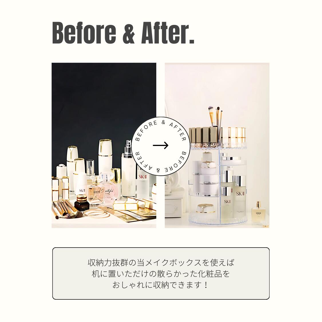 ・化粧水や乳液、口紅、メイク道具などを纏めて収納できる大容量設計。 ・棚は360度静かにスムーズに回転するため、後ろにある化粧品も簡単に取り出せます。 ・棚はフレームに空いた溝に差し込んで高さ調節ができ、長いボトルも余裕で収納可能です。 ・上段は仕切りが多く、口紅などの収納がしやすく、中央部分は円形のホルダーになっているため、メイクブラシを立てて整理できます。 ・側面にダイヤモンドパターンを施した耐久性に優れた材質を使用し、圧迫感が少なくお洒落にディスプレイできます。 ・底面は滑り止め加工を施し、ズレにくく安定性が高い。 【製品保証3ヶ月】購入日から3ヶ月間保証。 自然故障の場合に限り保証(交換)いたします。 (故意の破損、落下による破損等は保証の対象外) **保証申請はメールにてご連絡をお願いいたします。 【関連キーワード】 コスメ収納 棚 コスメ収納ボックス おしゃれ 透明 大容量 安い アクリル 仕切り ケース 韓国 アイデア 家 オーガナイザー 大きい 回転 可愛い 回転式 高級 3段ボックス 三段 縦長 机 机の上 見せる収納 360 可動式 360度回転 クリア 化粧水 積み上げ リップ 立体 段 ブラシ立て プラスチック プロ用 プロ仕様 人気 家用 乳液 積み重ね 使いやすい 間仕切り 北欧 エレガント 頑丈 ドレッサー ブランド コスメブラシ ブラシ プレゼント 収納 卓上 多段 かわいい スタンド 多機能 女性 たくさん サンプル 試供品 立てる 筆 ワンルーム 便利 便利グッズ グッズ パウダー 香水 【記念日等キーワード 】 楽天スーパーセール お買い物マラソン マラソンセール 感謝祭 ブラックフライデー 買いまわり お返し お礼 クリスマス クリスマスプレゼント クリスマスプレゼント 父の日ギフト スーパーセール バレンタイン 歓迎会 還暦祝い 敬老の日 結婚記念日 ギフト プレゼント レジャー 記念日 記念品 合格祝い 仕事 就活 就職 就職祝い 就職準備 新生活 新生活応援 新生活準備 成人式お祝い 贈り物 卒業 卒業記念品 卒業祝い 退職祝い 誕生日 誕生日プレゼント 通学 通勤 転勤 入学 入学式 入学祝い 入社 入社式 父の日 父の日ギフト 父の日プレゼント 母の日 巳の日 旅行 12月 アウトドア いい夫婦の日 お祝い 誕プレ p10倍 ポイント10倍 ポイ活 誕生日プレゼント バースデー