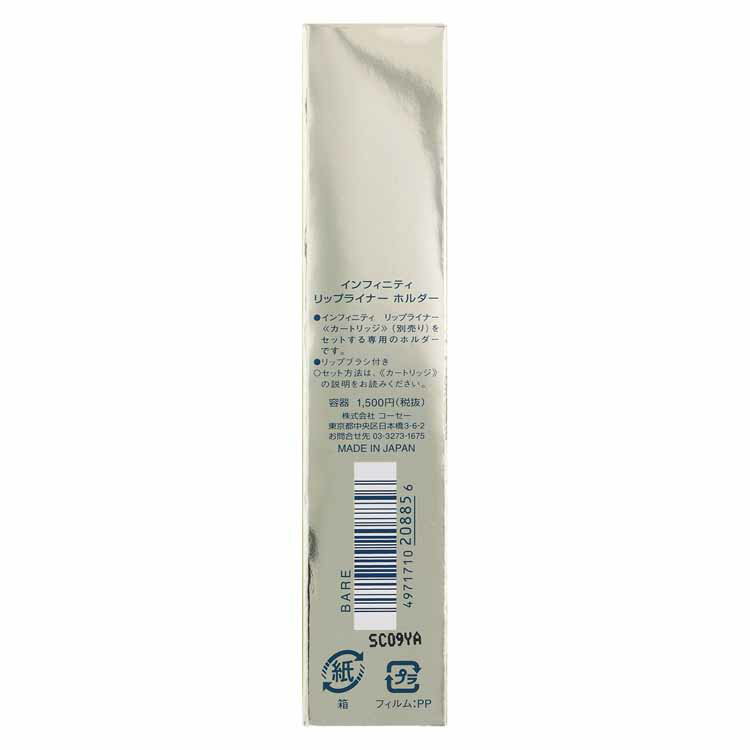 [BEAUTY]インフィニティ リップライナー (カートリッジ) (別売り) をセットする専用のホルダーです。リップブラシ付き。 《BR300》 【配合成分】エチルヘキサン酸セチル、セレシン、トリオクタノイン、水添ポリイソブテン、キャンデリラロウ、ポリエチレン、マイクロクリスタリンワックス、セスキオレイン酸ソルビタン、トコフェロール、ハトムギ油、ヒアルロン酸Na、メチコン、水添レシチン、 (+/-) 、マイカ、酸化鉄、硫酸Ba、赤201、赤202 《RD400》 【配合成分】エチルヘキサン酸セチル、セレシン、トリオクタノイン、水添ポリイソブテン、キャンデリラロウ、ポリエチレン、マイクロクリスタリンワックス、セスキオレイン酸ソルビタン、トコフェロール、ハトムギ油、ヒアルロン酸Na、メチコン、水添レシチン、 (+/-) 、マイカ、酸化チタン、酸化鉄、硫酸Ba、黄4、赤202 《RO600》 【配合成分】エチルヘキサン酸セチル、セレシン、トリオクタノイン、水添ポリイソブテン、キャンデリラロウ、ポリエチレン、マイクロクリスタリンワックス、セスキオレイン酸ソルビタン、トコフェロール、ハトムギ油、ヒアルロン酸Na、メチコン、水添レシチン、 (+/-) 、マイカ、酸化チタン、酸化鉄、硫酸Ba、黄4、青1、赤201、赤202 《RO601》 【配合成分】エチルヘキサン酸セチル、セレシン、トリオクタノイン、水添ポリイソブテン、キャンデリラロウ、ポリエチレン、マイクロクリスタリンワックス、セスキオレイン酸ソルビタン、トコフェロール、ハトムギ油、ヒアルロン酸Na、メチコン、水添レシチン、 (+/-) 、マイカ、酸化チタン、酸化鉄、硫酸Ba、青1、赤201、赤202 《BE301》 【配合成分】エチルヘキサン酸セチル、セレシン、トリオクタノイン、水添ポリイソブテン、キャンデリラロウ、ポリエチレン、マイクロクリスタリンワックス、セスキオレイン酸ソルビタン、トコフェロール、ハトムギ油、ヒアルロン酸Na、メチコン、水添レシチン、 (+/-) 、マイカ、酸化チタン、酸化鉄、硫酸Ba、赤202 《リップライナー ホルダー》 メーカーコーセー 《BR300/RD400/RO600/RO601/BE301》 メーカーコーセー 規格0.2g