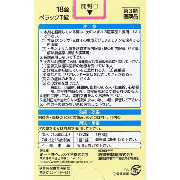 [BEAUTY]<特徴>ペラックT錠は、炎症やアレルギーをおさえる作用のあるトラネキサム酸、カンゾウ乾燥エキスの他に、タンパク質や脂質の代謝に関与し、皮膚や粘膜の機能を正常にはたらかせるビタミンB2、ビタミンB6と体力消耗に効果のあるビタミンCの3種のビタミンを配合した薬です。空気の乾燥・汚れやかぜなどからくるのどの炎症である咽頭炎・扁桃炎(のどの痛み、のどのはれ)によく効き、7歳の小児から服用できる薬です。トラネキサム酸配合炎症やアレルギーをおさえる作用のあるトラネキサム酸を、成人(15歳以上)1日量あたり750mg配合しています。のどの痛み、のどのはれにすぐれた効果トラネキサム酸とカンゾウ乾燥エキスの2つの成分が有効に作用して、のどの炎症をおさえます。眠くなる成分を含みません抗ヒスタミン剤を配合していませんので、眠くなりません。 《18錠》 品番 原産国日本 商品サイズ幅65mm×高さ105mm×奥行き24mm 《36錠》 品番 原産国日本 商品サイズ幅65mm×高さ105mm×奥行き31mm 《54錠》 品番 原産国日本 商品サイズ幅65mm×高さ105mm×奥行き45mm ※予告なくパッケージ、商品名、内容量、成分が変更になる場合がございます。予めご了承ください。
