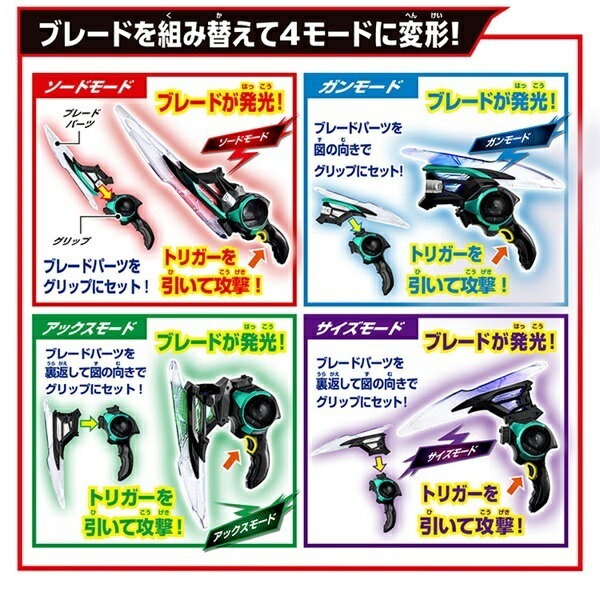 20251115 [KIDS]『仮面ライダーゼッツ』より、 4モードに変形!「DXブレイカムゼッツァー」が登場! ブレードパーツの付け替えで、ソードモード・ガンモード・アックスモード・サイズモードの4つのモードに変形! 「ブレイカムゼッツァー」のトリガーを引くと攻撃音が発動し、さらにカプセムをセットして回転させると必殺技が発動します。 モードに応じて攻撃音や必殺技音、発光が変化! 付属の「マシーナリーカプセム」を「変身ベルトDXゼッツドライバー(別売り)」にセットすると、 「仮面ライダーゼッツ テクノロムマシーナリー」への変身なりきり遊びが楽しめます。 【セット内容】 ・DXブレイカムゼッツァー本体…1 ・マシーナリーカプセム…1 (本商品のセット内容以外は付属しません。) メーカーバンダイ 電池LR44×3個(テスト用電池付属) パッケージサイズ 幅280x高さ240x奥行60mm コピーライト(c)2025 石森プロ・テレビ朝日・ADK EM・東映 対象年齢3才〜