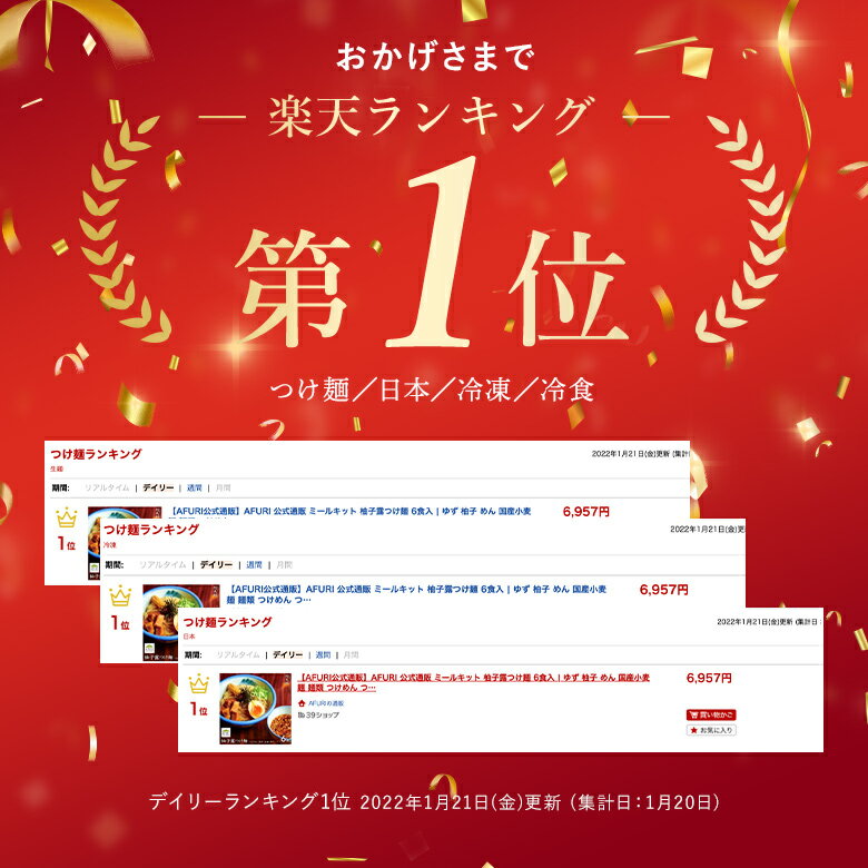 名称:AFURI 柚子露つけ麺 6食入 小麦、卵、豚肉、鶏肉、大豆、さけ、さば、鰹節、昆布、海苔、柚子果汁、塩、メンマ 内容量: ・自家製 真空手もみ麺(約155g)× 6玉 ・魚介醤油つけだれ(約160g)× 6食 ・つけだれ用 特製かやく 約10g x 2袋 ・高知県産 生搾りゆず果汁 5cc x 6本 ・特製角煮チャーシュー 約70g × 6袋 ・メンマ 約20g × 6袋 ・特上刻み海苔 × 6袋 ・特製割りスープ × 6袋 賞味期限:冷凍保存(-18℃以下)の場合、製造日より180日 解凍後は当日中にお召し上がりください。 保存方法:冷凍(-18℃以下) 製造者:AFURI株式会社/神奈川県愛甲郡清川村煤ケ谷1412 発送/配送 ・ご注文から発送まで、通常1-2日程度いただいております。 ・本品はクロネコヤマトさんのクール便でお送り致します 。 返品/交換 万一、商品に問題があった場合には、すぐに対応をさせていただきます。 商品受取り後2日以内に、メールまたは電話でご連絡ください 関連キーワード:ラーメン 拉麺 生麺 冷凍 だし 出汁 具付き 具材セット お取り寄せグルメ 取り寄せグルメ 誕生日 誕生日プレゼント お歳暮 お祝い 御祝い 内祝い 金婚式御祝 銀婚式御祝 御結婚お祝い ご結婚御祝い 御結婚御祝 結婚祝い 結婚内祝い 結婚式 引き出物 引出物 御新築祝 新築御祝 新築内祝い 祝御新築 祝御誕生日 バースデー バースディ バースディー 昇進祝い 昇格祝い 就任合格祝い 成人式 御成人御祝 就職祝い 社会人 御開店祝 開店御祝い 開店お祝い 開店祝い 御開業祝 周年記念 来客 異動 転勤 定年退職 退職 挨拶回り 転職 お餞別 贈答品 粗品手土産 心ばかり 寸志 新歓 歓迎 送迎 新年会 忘年会 二次会 記念品 景品 開院祝い 御礼 お礼 謝礼 御返し お返し お祝い返し 御見舞御礼追加麺(替え玉)をご希望の方へ! AFURI 真空手もみ麺の追加麺(替え玉)のご注文はこちら 商品説明 新鮮な鶏ガラや香味野菜、昆布や煮干し、節類(鰹節、うるめ節、さば節等)など厳選した素材をふんだんに使い、じっくり時間と手間をかけて旨味を凝縮させた出汁。ここに、キレのある3種の醤油や魚醤、黒酢、香味油等で深いコクと食欲をそそる風味に仕上げた特製のつけだれは、AFURIオリジナルの味。高知県産の香り良い生搾りゆず果汁を加え、冷製(麺・つけだれ共に冷)でいただくのがAFURIスタイルです。 麺は、特徴の異なる2種の国産小麦に加え、栄養価の高い全粒粉を配合。それらを真空ミキサーで練り上げ、手もみ処理を施した、店舗と同じ「真空手もみ麺」でご用意しました。 具材には、こちらも店舗と同じたっぷりジューシーな角煮チャーシューと、特製メンマ(麻竹細切りの甘辛煮)、特上刻み海苔を添えております。お好みで、水菜や煮玉子などを加えてお召し上がりください。 1食あたり内容 自家製 真空手もみ麺(約155g) つけだれ用 特製かやく 約3g 高知県産 生搾りゆず果汁 15cc 特製角煮チャーシュー 約70g メンマ 約20g 特上刻み海苔 特製割りスープ 賞味期限 冷凍保存(-18℃以下)の場合、製造日より180日 解凍後は当日中にお召し上がりください。 保存方法 要冷凍 アレルギー成分 卵、小麦、豚肉、鶏肉、大豆、さけ、さば、ごま 栄養成分表示(1食あたり) エネルギー 826kcal たんぱく質 27.9g 脂質 31.6g 炭水化物 104.0g 食塩相当量 6.6g