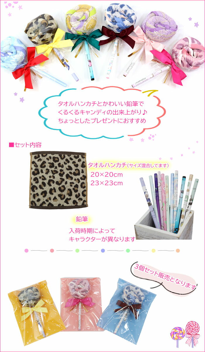 くるくる キャンディ風 プチギフト 3個セット ハンカチ えんぴつ ぷちギフト プチ イベント 誕生日 プレゼント 女の子 子供会 小学生 園児 かわいい 景品 参加品 お返し ab-578100