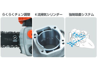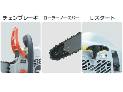 ●立木の伐倒や間伐作業などに適しています。●チェンブレーキ万一のキックバック発生時には、慣性力により、チェンブレーキが作動。瞬時にソーチェンの回転を停止します。●ローラーノーズバーバー先端のローラーがバーとチェンの摩擦を最小限におさえることでエンジンのパワーを最大限に生かします。●Lスタートリコイル引き力をアシストするコイルダンパーを採用することで、引き力を従来機の約1/2に軽減しました。●らくらくチェン調整面倒なチェン張り作業がしやすいよう、本体横から簡単に調整することができます。【使い方】1:ストップスイッチを始動位置にしてください。2:チョークノブを手前に引いてください。3:プライマリポンプを押す・離すを数回繰り返しポンプ内に燃料が上がったことを確認します。4:前ハンガードを前方に押し、チェンブレーキを作動させます。5:チェンソーをしっかり押さえ、スタータグリップを最初の初爆音がするまで数回引いてください。6:初爆音がしたらすぐにチョークノブをもとに戻してください。7:再びチェンソーをしっかり押さえ、スタータグリップを引くとエンジンは始動します。8:エンジン始動後は、スロットルロックアウトを押してから、スロットルトリガーを少しだけ引いてスロットルを低速状態にします。9:前ハンドガードを手前に引いて、チェンブレーキを解除します。 メーカー 共立エコー 品番 GC421 JANコード 4934110210478 寸法(長さ×幅×高さ) 395×245×277mm 本体乾燥質量 4.6kg 排気量 40.2ml ガイドバー 45cm チェンタイプ 21BPX-72E エンジン始動方式 Lスタート 燃料タンク容量 0.41L オイルタンク容量 0.28L スパークプラグ BPM8Y 三軸合成値 4.8m/s2 使用燃料 混合燃料