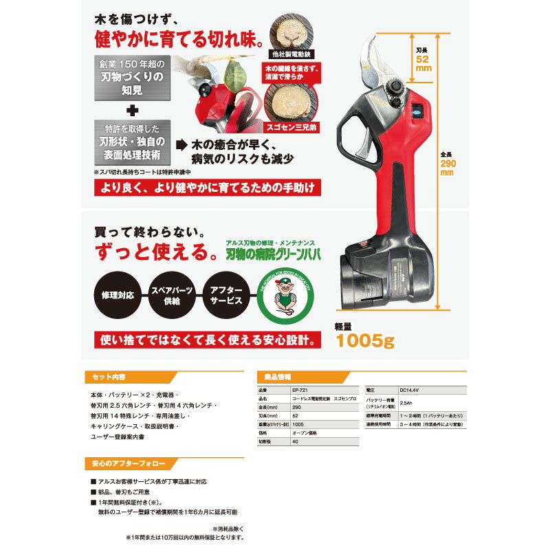 ●アルスからあらゆる剪定に対応したプロのニーズに応えた電動剪定鋏が登場!●特許技術で磨き上げられた刃とハイパワーモーターにより最大40mmの驚異の切断力を実現●スパスパ切れるので、作業効率もUP!●切断面を潰さずスパッと切るので癒合が早く病気リスクも減少●切る枝の太さに合わせて刃の開閉幅は無段階に調整可能!●安全性能も進化!従来のトリガー追従式の刃に加えて安全センサーも装備。●切味抜群で使いやすい!日常的に選定作業を行うプロ向けの一台です! メーカー アルス 製品コード EP-721 JANコード 4965280810335 全長 290mm 刃長 52mm 切断目安 生木直径40mm 本体重量 1005g(バッテリー込) 連続使用時間 3〜4時間(バッテリー1個あたり) 充電時間 約1〜2時間(バッテリー1個あたり) 電圧 DC14.4V バッテリー容量(リチウムイオン電池) 2.5Ah 付属品 替刃用六角レンチ3種、専用油差し(容器のみ)、バッテリー2個、専用ホルスター、ハードケース、取扱説明書(保証書)、ユーザー登録案内書