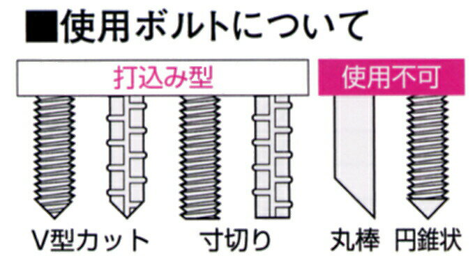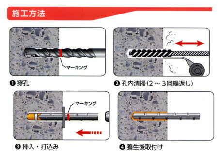 画像は代表画像です。サイズ感などは変わります。 特徴 高性能樹脂「エポキシアクリレート樹脂」の採用により、優れた固着力を発揮します。 コンクリート、ブロックなどにカクハンせず打込むだけで簡単に施工する事が出来ます。 使用するボルト・異形棒鋼は、斜めカットせずに直角切り、V型カットの状態で使用してください。 叩き込むだけのタイプなので、L字筋・U字筋も施工する事ができ、耐アルカリ性に優れています。 付属のスポンジ製ワッシャーを使用すると、天井や壁面への施工時に液飛散や液もれを防ぐことができます。 用途 増改築用差筋、タラップ取り付け、U字筋やL字筋、車止め、機器取り付け、アンテナ取り付け等 硬化時間の目安 最大強度80%程度を発揮するまでの目安時間 -5℃の場合 気中:360分 0℃の場合 気中:180分 5℃の場合 気中:120分 10℃の場合 気中:70分 15℃の場合 気中:45分 20℃の場合 気中:30分 25℃の場合 気中:25分 30℃の場合 気中:20分 施工上の注意点 施工温度が5℃以下の時は、ボルトを打込後に直ちにボルトを5回転以上させて下さい。 マイナス5℃以下の環境では使用しないでください。 天井面に施工の場合は、同梱のストッパーをご使用ください。 壁面、天井面に施工する場合は、液ダレにご注意ください。 使用期限を必ず守ってください。 カプセル径 16.5mm 全長(mm) 120mm 容量cm³ 23cm³ 使用ボルト ボルト:M16 W5/8異形棒鋼:D16 下穴(径×深さmm) ボルト:19.0mmφ×140mm異形棒鋼:20.0mmφ×140mm 最大荷重(kN) 最大引張荷重:92.8kN許容引張荷重(長期):25.3kN許容引張荷重(短期):38.0kN 入数 1本 JCAA認証 有り SHASE-S規格品 ○ よく検索されるキーワード ■納期&配送について通常在庫品(土日祝、大型連休はお休みです)⇒買い足しはコチラから