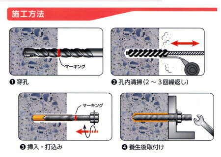 画像は代表画像です。サイズ感などは変わります。 特徴 高性能樹脂「エポキシアクリレート樹脂」の採用により、優れた固着力を発揮します。 一度施工してしまえば、固定力の経時変化がほとんどありません。 抜群の対アルカリ性能を発揮し、初期剛性が高く靭性に優れています。 水中施工する事もできます。 サイズ展開が多いので、目的に応じ幅広い施工環境に対応することができます。 ボルト・異形鉄筋を片側斜め45度カット、またはV型カットして使用してください。 用途 耐震補強(鉄骨ブレース取り付け)、増改築用差筋、RC壁や柱梁の補強、防音壁取り付け、落橋防止、橋脚補強、防舷材取り付け、堤防かさ上げ、シラ材や車止め取り付け、係船柱や係船環取り付け、防護柵取り付けなどに 硬化時間の目安 最大強度80%程度を発揮するまでの目安時間 -20℃の場合 気中:720分 水中:− -10℃の場合 気中:180分 水中:− -5℃の場合 気中:100分 水中:− 0℃の場合 気中:60分 水中:120分 5℃の場合 気中:40分 水中:80分 10℃の場合 気中:25分 水中:50分 15℃の場合 気中:18分 水中:36分 20℃の場合 気中:15分 水中:30分 25℃の場合 気中:12分 水中:24分 30℃の場合 気中:10分 水中:20分 施工上の注意点 打込み後、硬化時間内はボルトや異形棒鋼を動かさないでください。 天井面に施工の場合は、ストッパーをご用意ください。 ストッパーは同封されていません。 使用期限を必ず守ってください。 サイズタイプ ショート カプセル径 13.0mm 全長(mm) 65mm 容量cm³ 6.0cm³ 使用ボルト ボルト:M12 W1/2異形棒鋼:D13 下穴(径×深さmm) ボルト:14.5mmφ×60mm異形棒鋼:16.0mmφ×65mm 最大荷重(kN) 最大引張荷重:35.7kN許容引張荷重(長期):5.7kN許容引張荷重(短期):8.6kN 入数 1本 JCAA認証 − SHASE-S規格品 − よく検索されるキーワード 水中施工OK ■納期&配送について取寄、1-2日で発送予定(土日祝大型連休除く⇒買い足しはコチラから