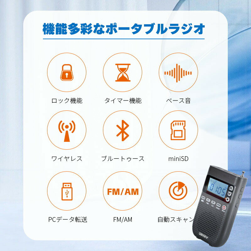 【多機能な充電式ポータブルラジオ♪】コンパクトサイズながらすごい多機能、type-cコードとストラップも付属!災害時から、ご自宅、電車などの公共場所にも便利なポータブルラジオです。ラジオ・スピーカー・目覚まし(予定時刻にラジオ)・自動電源オフ・microSDでの音楽プレイヤー・Bluetooth・ワイヤレススピーカー機能を備えた超多機能モデルです。ライト付きLCD画面つきでとても見やすいです。 【DSP技術採用】DSP技術を採用しており、膨大なデータ処理と高速起動、信号が安定しており、高感度で高受信です。全周波数:FM:76-108MHZ AM:522-1710KHZ【長時間使える2000mAhの充電式】付属のUSBケーブルで4.5時間でフル充電となります。(ACアダプターは付属しておりませんので、別途ご購入いただくか、モバイルバッテリー、お持ちのUSB接続のアダプター等をご利用ください。)【選局自動登録機能・ロック機能】手動選局のほか、自動選局でき、その際に自動で保存してくれます。誤作動防止のロック機能も付いており、手が当たったり、カバンの中でボタンが当たってしまう、、なんてこともありません。(鍵のマークのボタン長押しで切り替え。)【時計・目覚まし機能付き】本機には、時計機能と目覚まし機能もついています。目覚ましは、設定した時間にラジオを流すことができ、聞きたかったラジオを逃しません。タイマー機能(自動電源オフ)は、ラジオをつけっぱなしで寝てしまった、、なんてこともありません。【MP3プレイヤー】microSDカードを別途ご用意いただき、そちらに保存されたMP3音源を聴くことができます。また、ケーブルをPCと接続して本機にmicroSDをさしたまま曲の保存、消去もできます。(microSDカードは付属しません。)そして、お持ちの携帯電話の音源も接続してワイヤレススピーカーとしての活用もできます。【Bluetooth5.3】Bluetooth5.3搭載で、お持ちのワイヤレスイヤホンで楽しむこともできます。また、本機をラジオの電波の入りやすいところに置き、ワイヤレススピーカーを接続して別のところで安定して楽しむといったこともできます。【商品内容】通勤や学習、公園へ散歩や朝のウォーキングや防災にもおすすめです!1セットの商品内容:ポケットラジオ x1、USB-A to Type-cコード x1、ストラップ x1、日本語取扱説明書 x1商品仕様:AM:522-1710KHzFM:76-108MHzイヤホンジャック:3.5mm2つの検索方法:手動、自動サイズ:125x70x22mmカラー:ブラック、グレー電池容量:2000mAh※ACアダプター、microSDカードは付属しません。※ご注意本商品は、電波法令で定められている技術基準に適合していることを証明する技適マークが貼付されていない無線機器であり、日本国内で使用する場合は、電波法違反になるおそれがございます。ご使用の際には、十分ご注意いただきますようお願いいたします。詳しくは、最寄りの総務省総合通信局へお問い合わせください。※撮影用小物類などは付属しておりません。※簡易包装でのお届けとなります。※モニターにより色合いが若干違いが生じる場合がございます。※デザインは入荷時期により若干変化する場合がございます※海外製造品のため、多少の匂い軽微な傷や汚れ、個体差等ある場合がございます。※商品の使用により生じた如何なる損害・被害も弊社では一切の責任を負いかねますので予めご了承ください。※発送方法について:お届け先、個数によって配送情報に記載の配送業者とは異なる場合がございます。日本郵便、または佐川急便(配送方法はご指定頂けません)でお届けいたします。