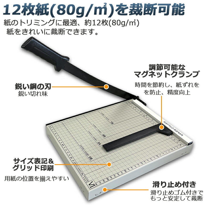 【製品仕様】製品サイズ:470X250X45mm、重量:1.6Kg、切断可能サイズ:300X250mm、ペーパーカッターの適用可能な切断範囲:A4、A5、B5、B6、B7【鋭利な刃】ペーパーカッターは非常に鋭利なスチールブレードを備えており、紙の束を簡単にカットできます。印刷用紙、写真用紙、カード用紙、薄いコート紙などの一般的な用紙は簡単にカットできます。【明瞭な目盛り】目盛りとメッシュのビニールカッティングマットが付いているので、毎回同じサイズの用紙をカットできます。カットエラーを防ぐために印刷をガイドできます。【滑り防止】切断機には、滑りを防ぐ自動ペーパーホルダーも付いています。さまざまなサイズの紙をしっかりと固定し、滑ることなくカットできます。【使用する場合】家庭、オフィス、プリントショップ、DIYに適しています。段ボール、カード、写真などをカットできます。事務用品の定番!ペーパーカッターです。A4サイズまでカット可能。切れ味抜群のスティール製ブレード採用で重ねた用紙も難なく切断できます!マグネット用紙抑え付でズレも防止。カットミスを防止するガイドライン印字付き。商品説明ペーパーカッター:A4サイズ 切断サイズ:B7/B6/A5/B5/A5/B5/A4サイズ(約)カット可能サイズ:300×250mm台サイズ:325×250mm刃のサイズ:先端(固定部)/刃後端320mm台の高さ:40mm重量(約):1.6kg