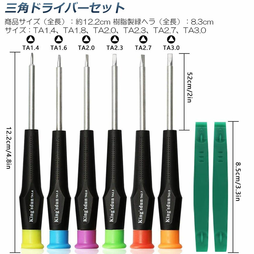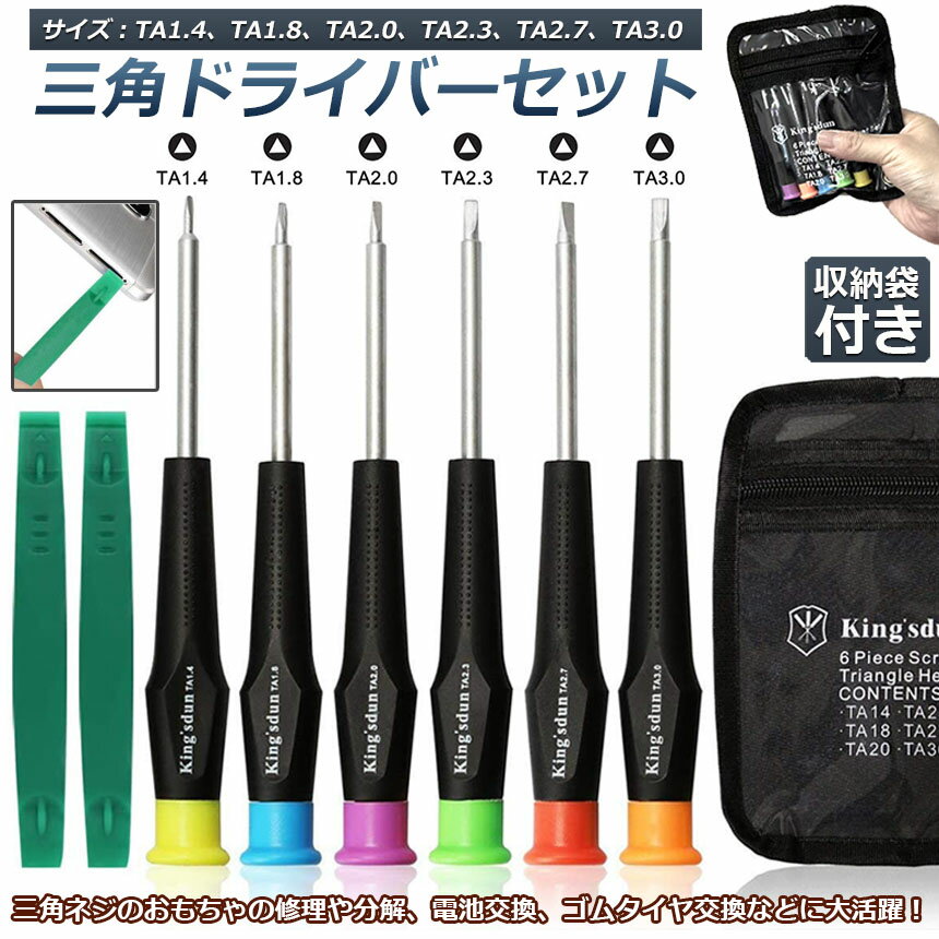 【ツール内容】三角ドライバー*6 、オープニングツール*2、防水バッグ【サイズ】商品サイズ(全長):約12.2cm 樹脂製緑ヘラ(全長):8.3cm 三角ドライバー6サイズ:TA1.4、TA1.8、TA2.0、TA2.3、TA2.7、TA3.0【6色のハンドルデザイン】各サイズごとに色分けされているので、サイズがわかりやすい。【高品質】磁気チップはクロームバナジウム6150#スチールで、ネジを簡単に吸収します!耐久性があり、靭性が高く、長年使用できます。ドライバーの先端には磁石が付いているので、作業時、しっかりねじを回すことができ、使いやく作業がしやすい。【幅広い用途】三角ネジのおもちゃの修理や分解、電池交換、ゴムタイヤ交換などに大活躍!おもちゃの修理以外にも景品や教材玩具などに使用されている三角ネジも回せます