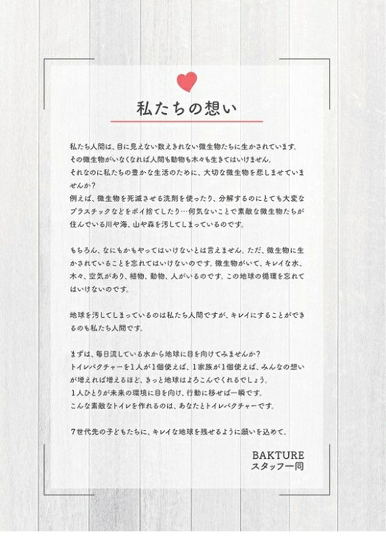 ☆私たちの想い☆ 私たち人間は、目に見えない数えきれない微生物たちに生かされています。その微生物がいなくなれば人間も動物も木々も生きてはいけません。 それなのに私たちの豊かな生活のために、大切な微生物を悲しませていませんか? 例えば、微生物を死滅させる洗剤を使ったり、分解するのにとても大変なプラスチックなどをポイ捨てしたり…何気ないことで素敵な微生物たちが住んでいる川や海、山や森を汚してしまっているのです。 もちろん、なにもかもやってはいけないとは言えません。ただ、微生物に生かされていることを忘れてはいけないのです。微生物がいて、キレイな水、木々、空気があり、植物、動物、人がいるのです。この地球の循環を忘れてはいけないのです。 地球を汚してしまっているのは私たち人間ですが、キレイにすることができるのも私たち人間です。 まずは、毎日流している水から地球に目を向けてみませんか? トイレバクチャーを1人が1個使えば、1家族が1個使えば、みんなの想いが増えれば増えるほど、きっと地球はよろこんでくれるでしょう。 1人ひとりが未来の環境に目を向け、行動に移せば一瞬です。こんな素敵なトイレを作れるのは、あなたとトイレバクチャーです。 BAKTURE スタッフ一同 7世代先の子供達に、キレイな環境を残せますように。